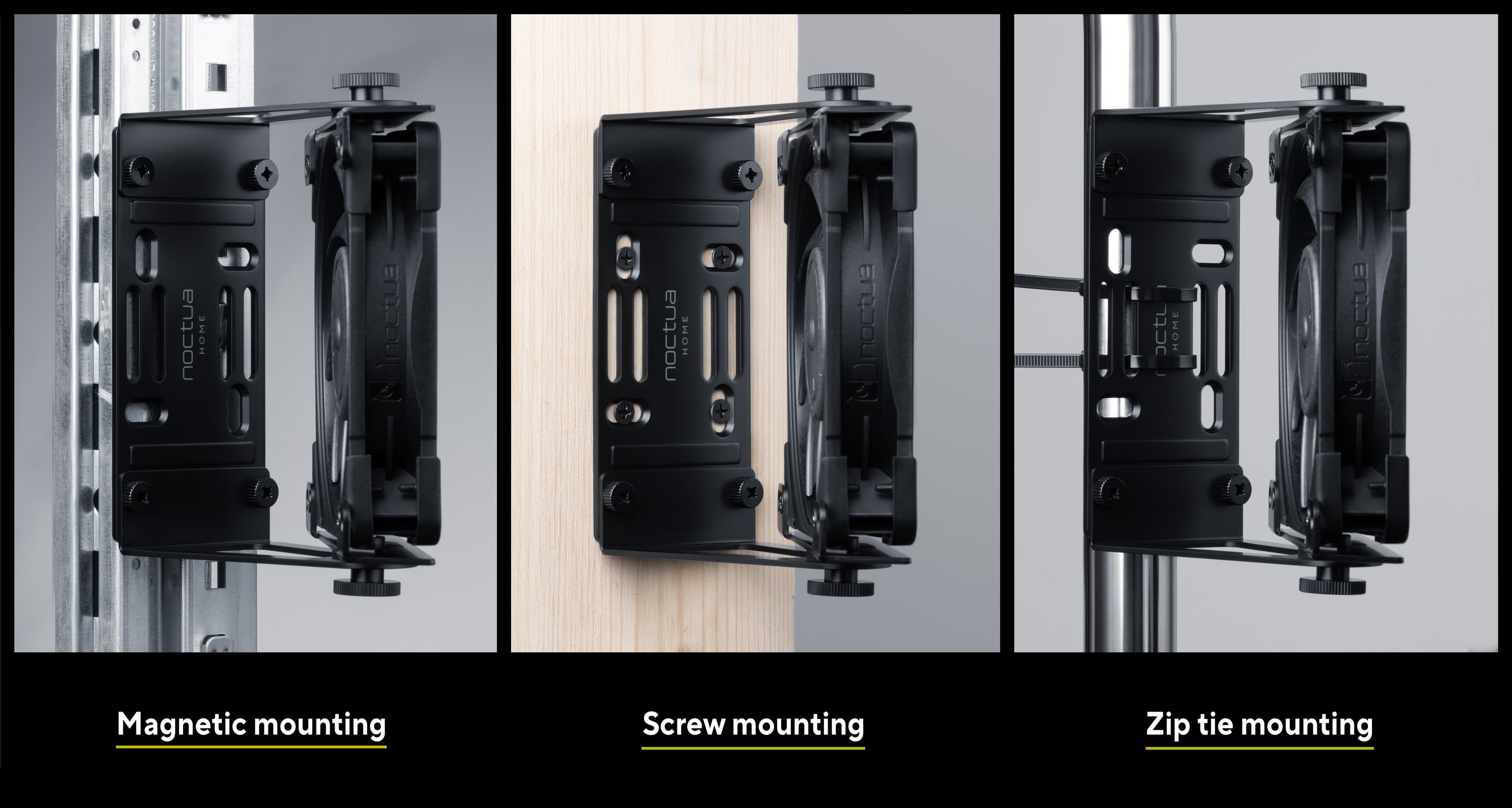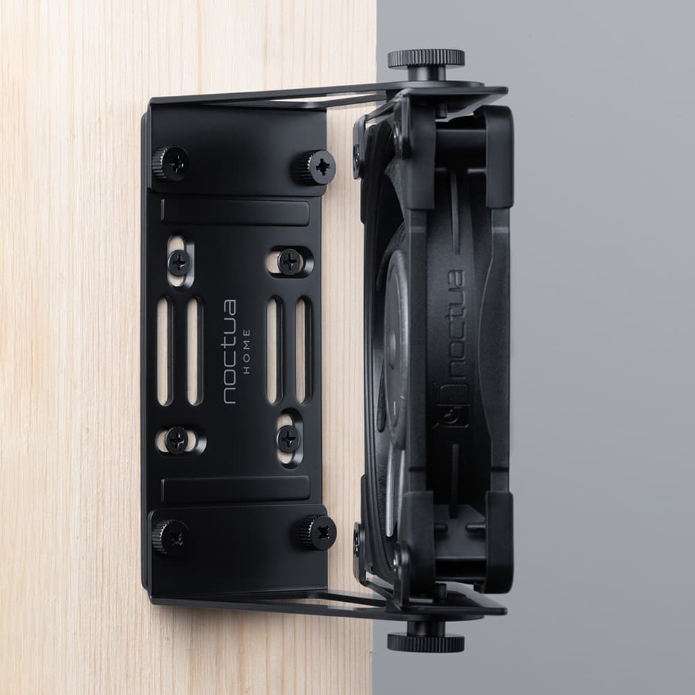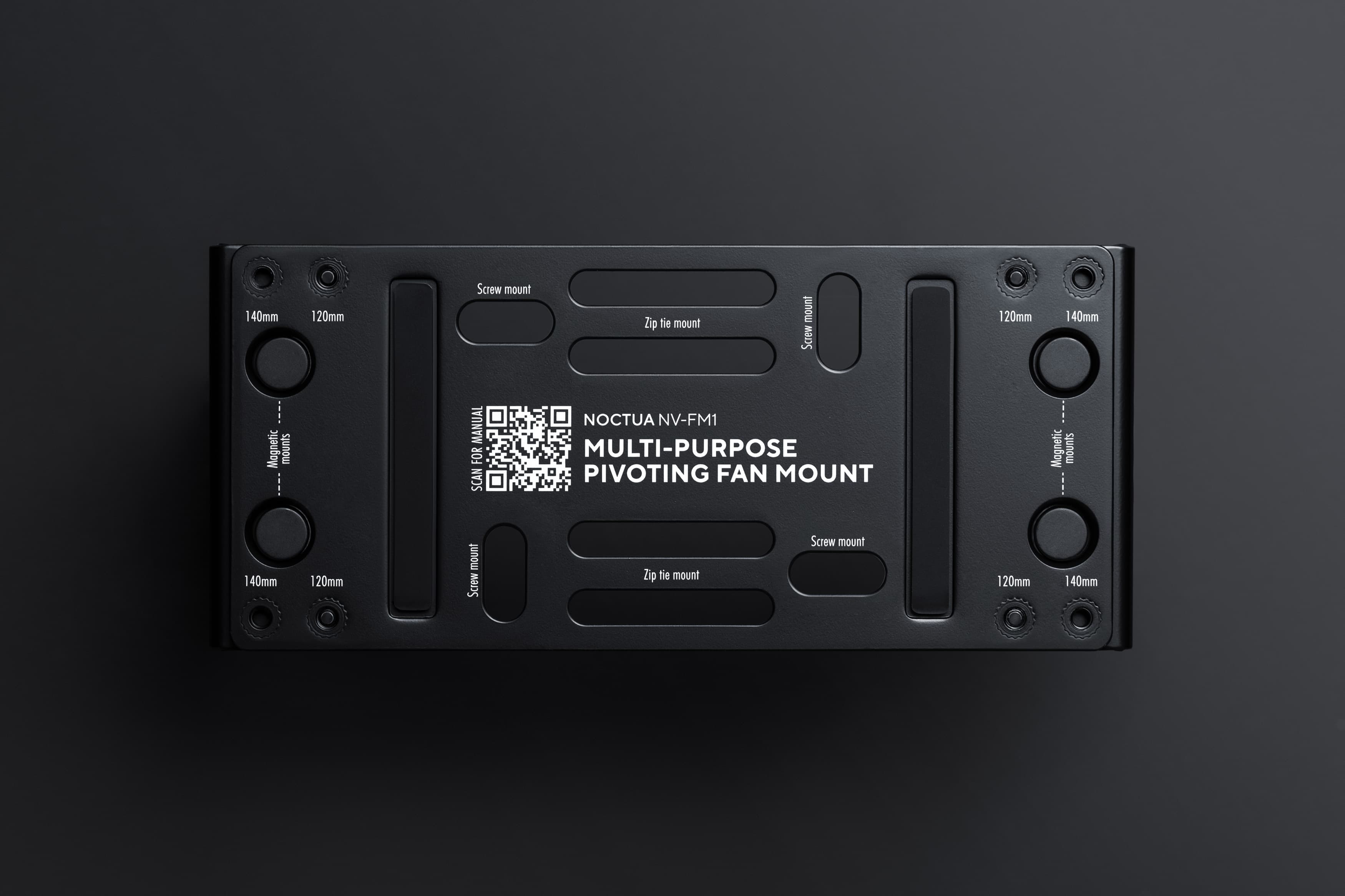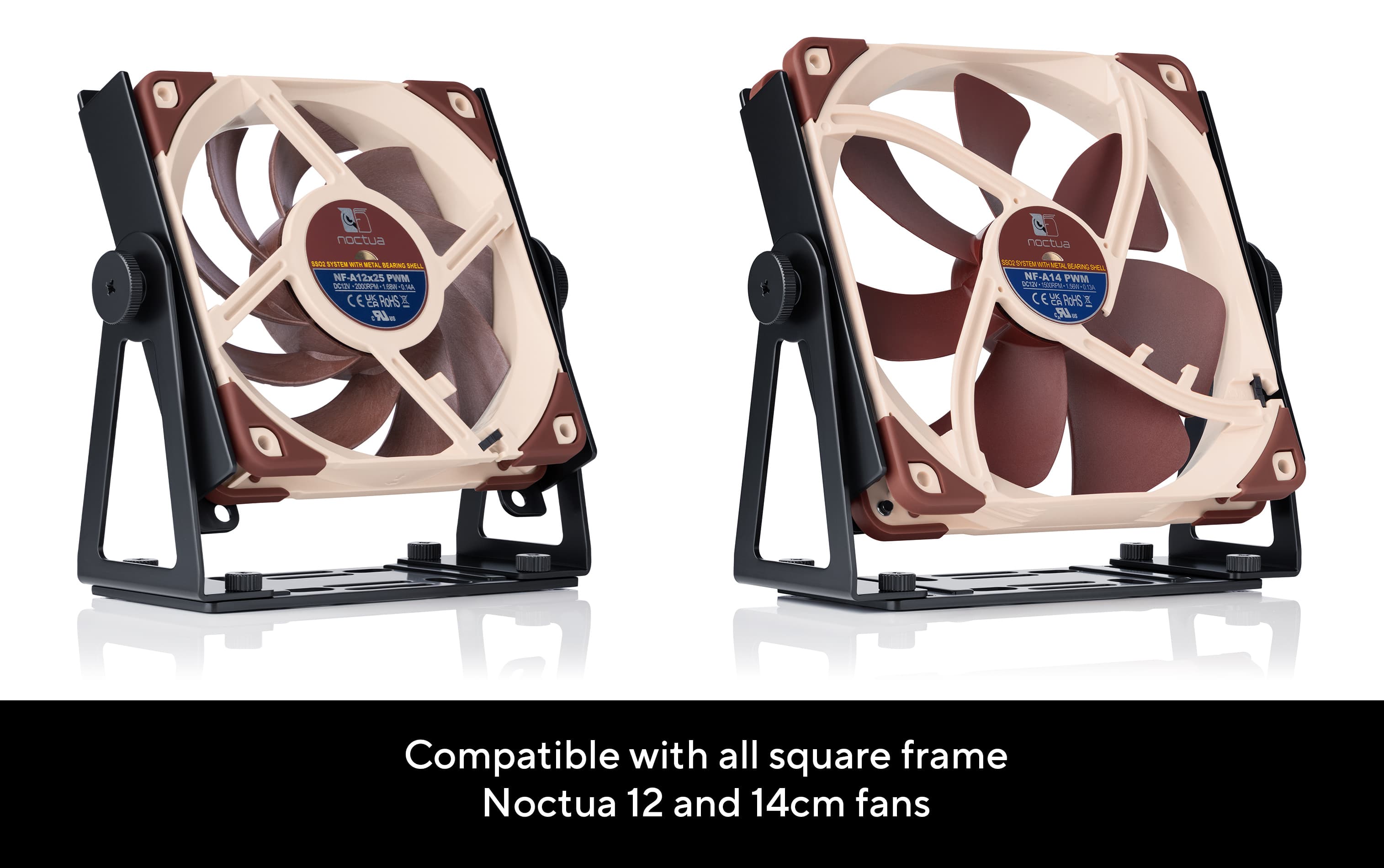 The NV-FM1 is compatible with all square frame 120 and 140mm fans from Noctua as well as most third-party units that use the standard 105x105 or 124.5x124.5mm hole spacings. It comes pre-assembled for use with 120mm fans but adjusting for 140mm only requires re-setting the side brackets in the appropriate position using the 4 screws at the base.