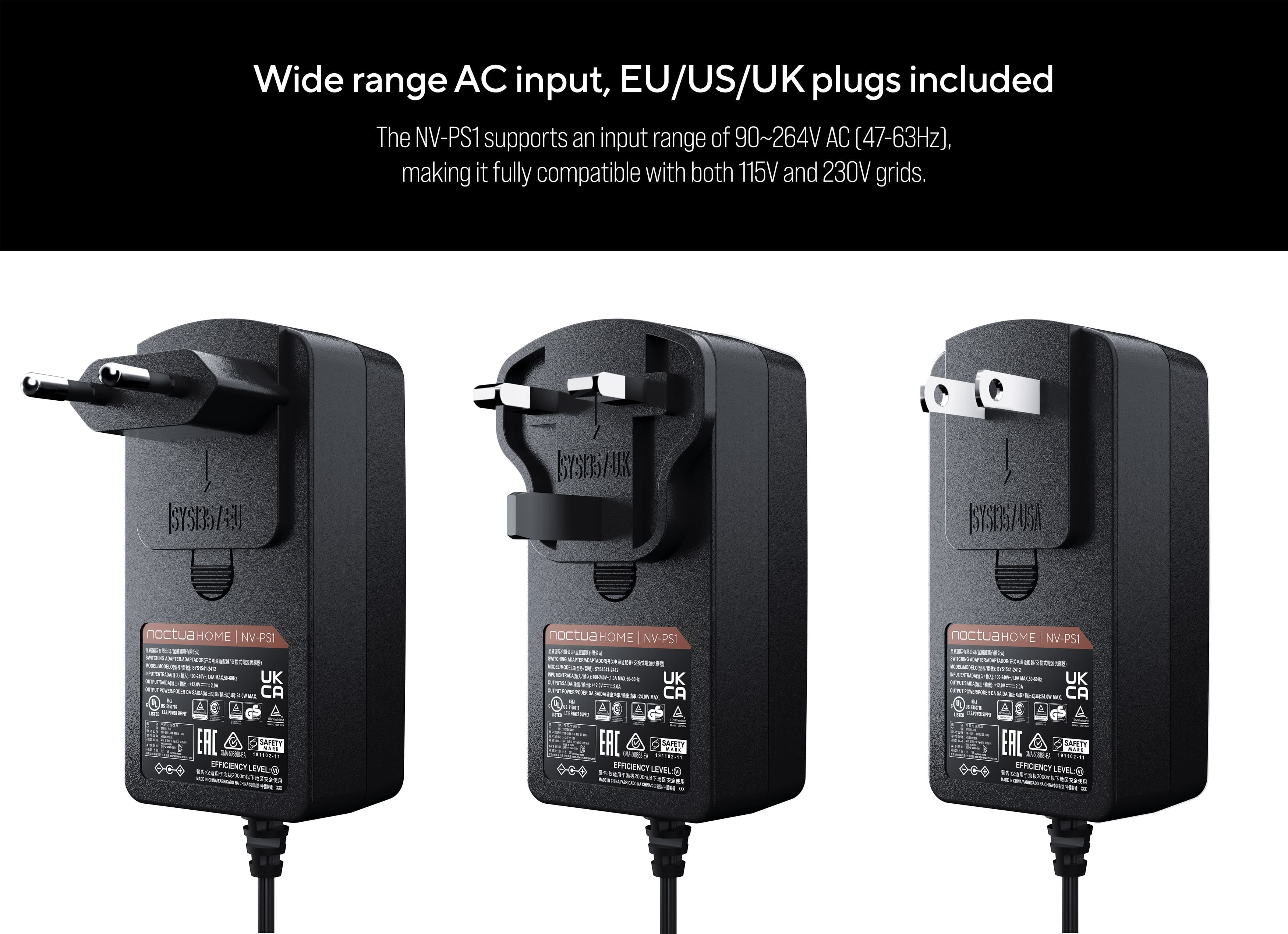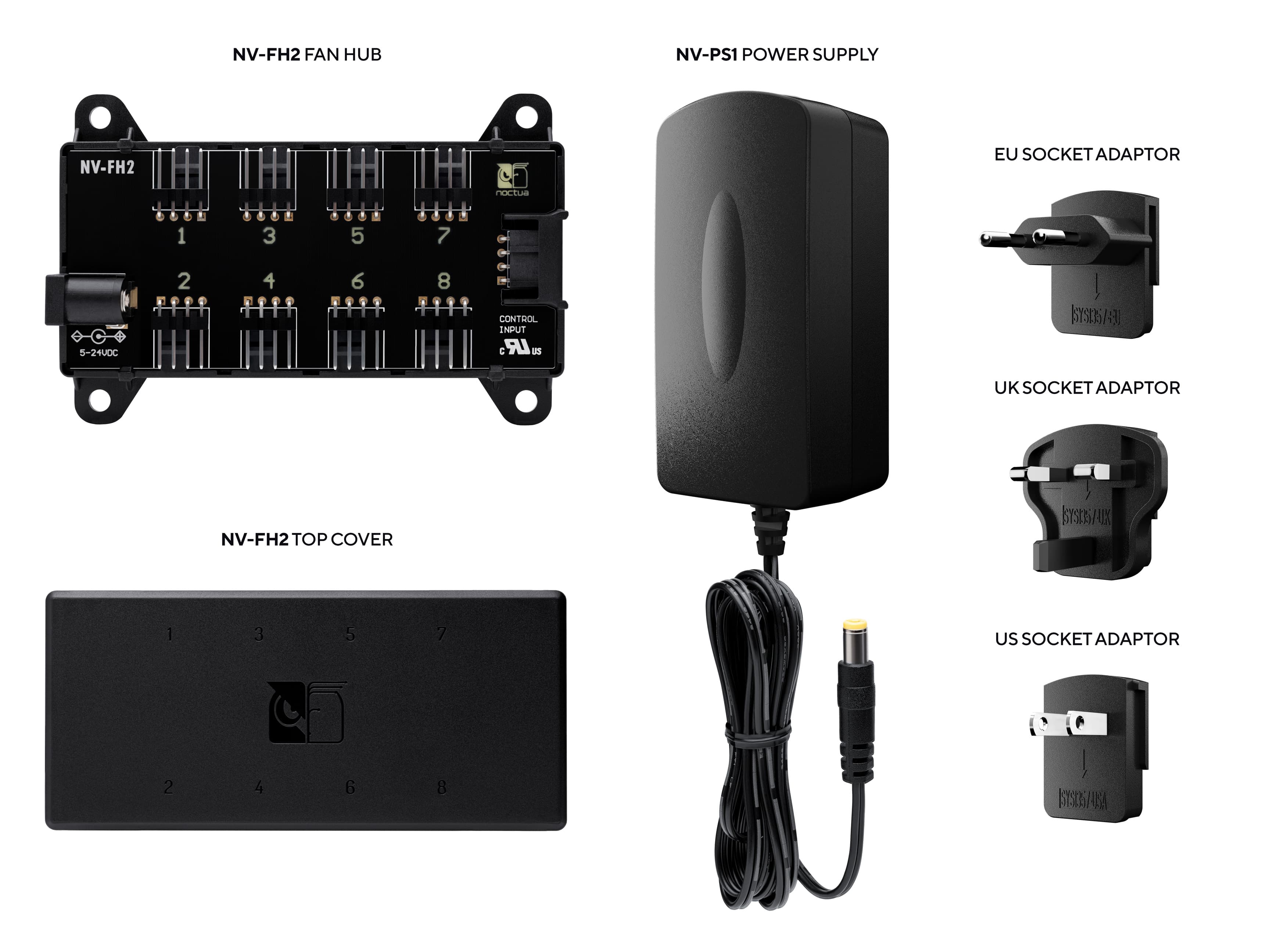 The NV-PS1 is a high quality 24W power supply with wide-range input (115/230V) and socket adaptors for EU, UK and US. With its excellent efficiency and minimum standby power consumption, it’s a perfect choice for powering 12V fans from wall outlets.