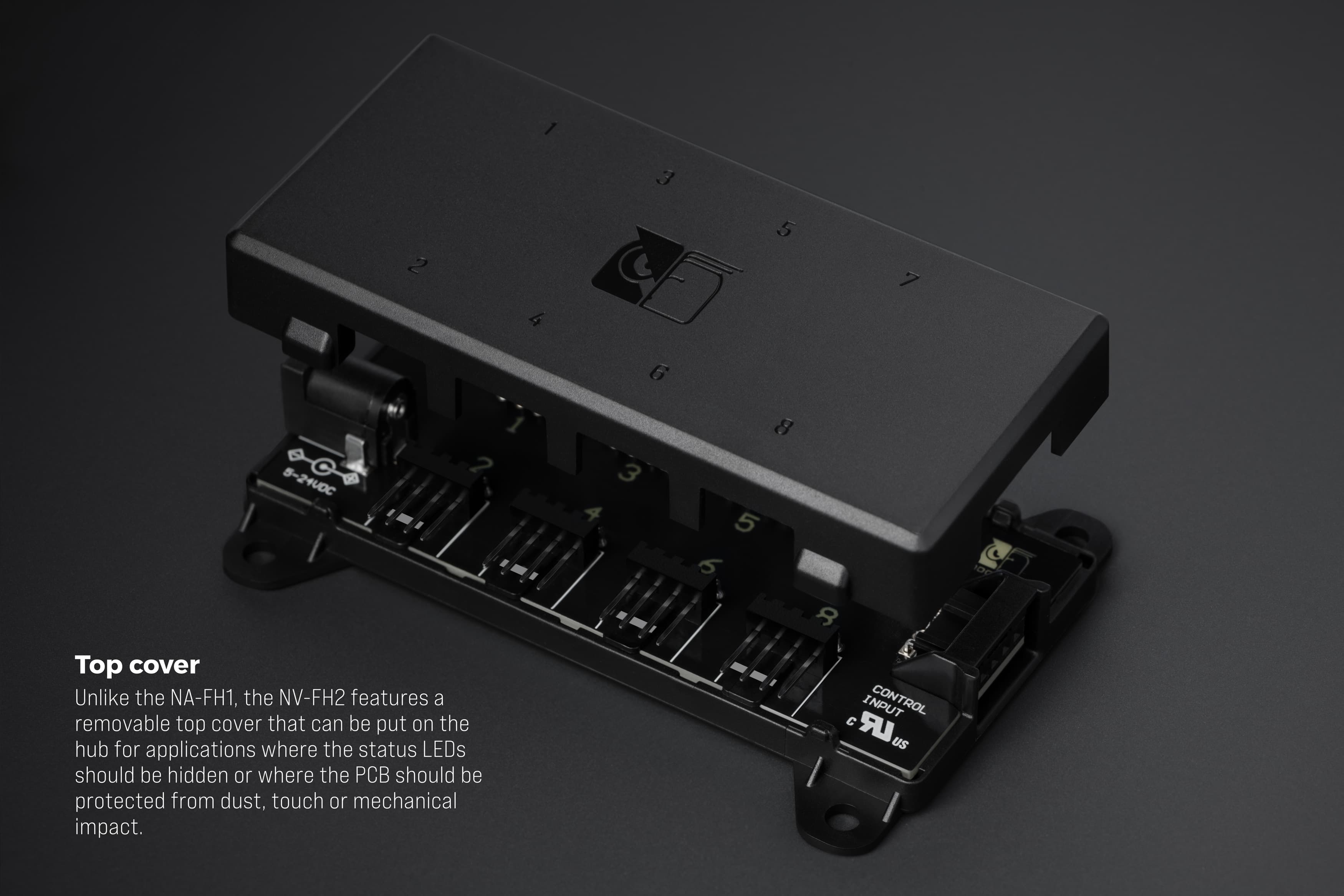 The NV-FH2 is a premium-grade 8 port fan splitter board that can take power via its 5.5mm barrel connector input and use its 4-pin PWM input for RPM monitoring and PWM control. With its removable clip-on cover, magnetic fixture and extra screw holes, it’s highly flexible and right at home in just about any application.