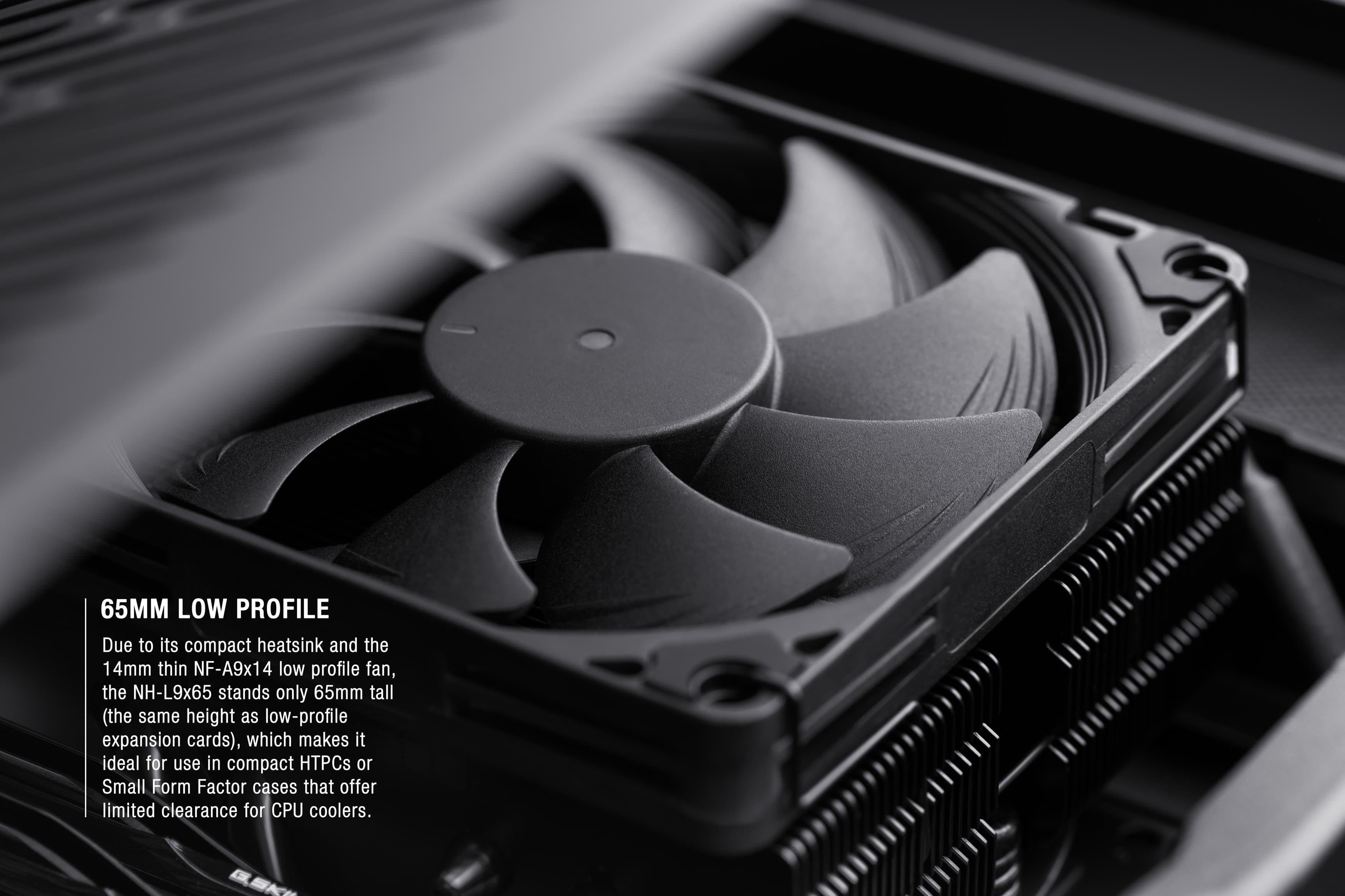 Due to its compact heatsink and the 14mm thin NF-A9x14 low profile fan, the NH-L9x65 stands only 65mm tall (the same height as low-profile expansion cards), which makes it ideal for use in compact HTPCs or Small Form Factor cases that offer limited clearance for CPU coolers.