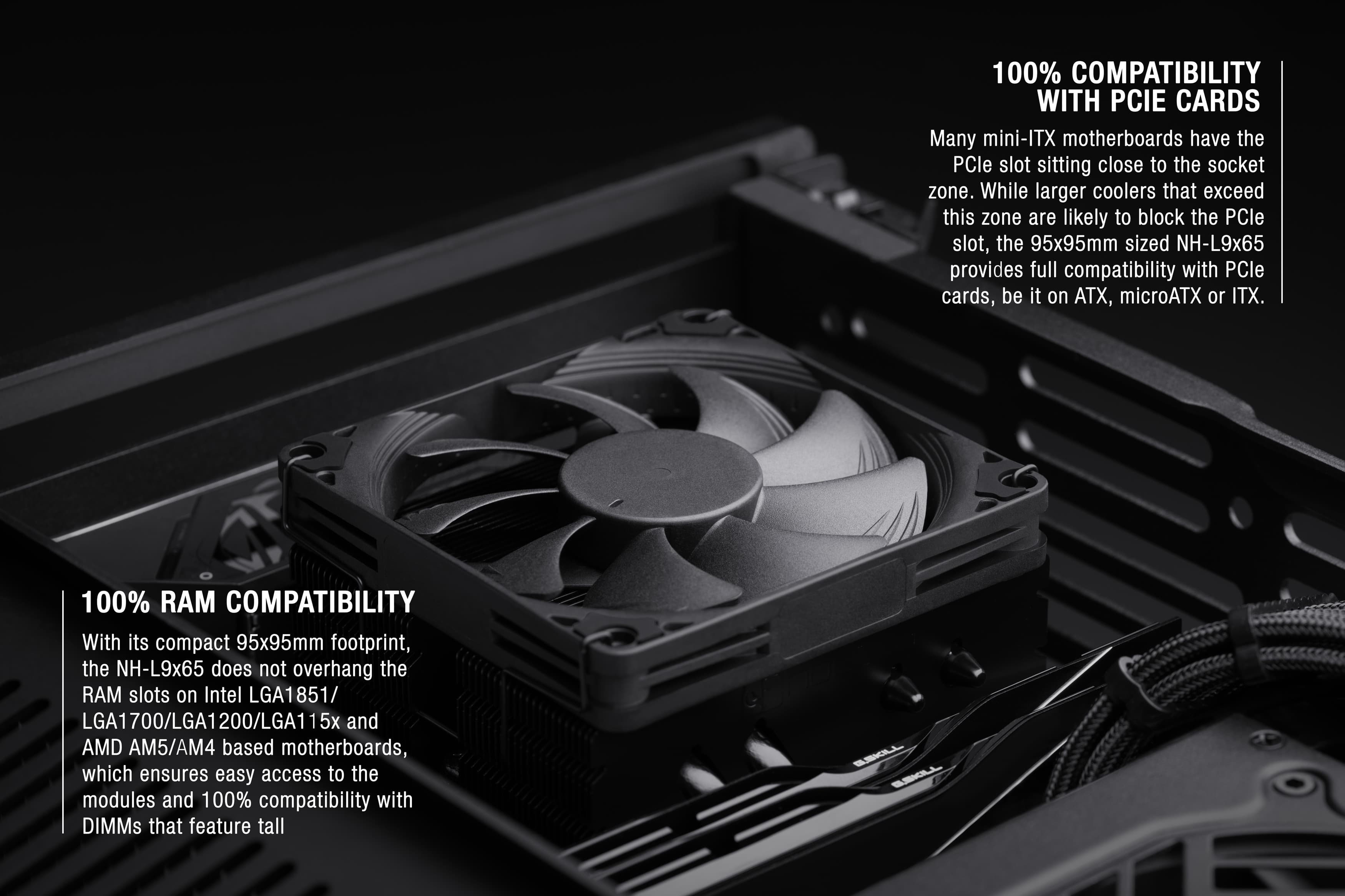 With its compact 95x95mm footprint, the NH-L9x65 does not overhang the RAM slots on Intel LGA1851/LGA1700/LGA1200/LGA115x and AMD AM5/AM4 based motherboards, which ensures easy access to the modules and 100% compatibility with DIMMs that feature tall heat-spreaders or RGB lighting.