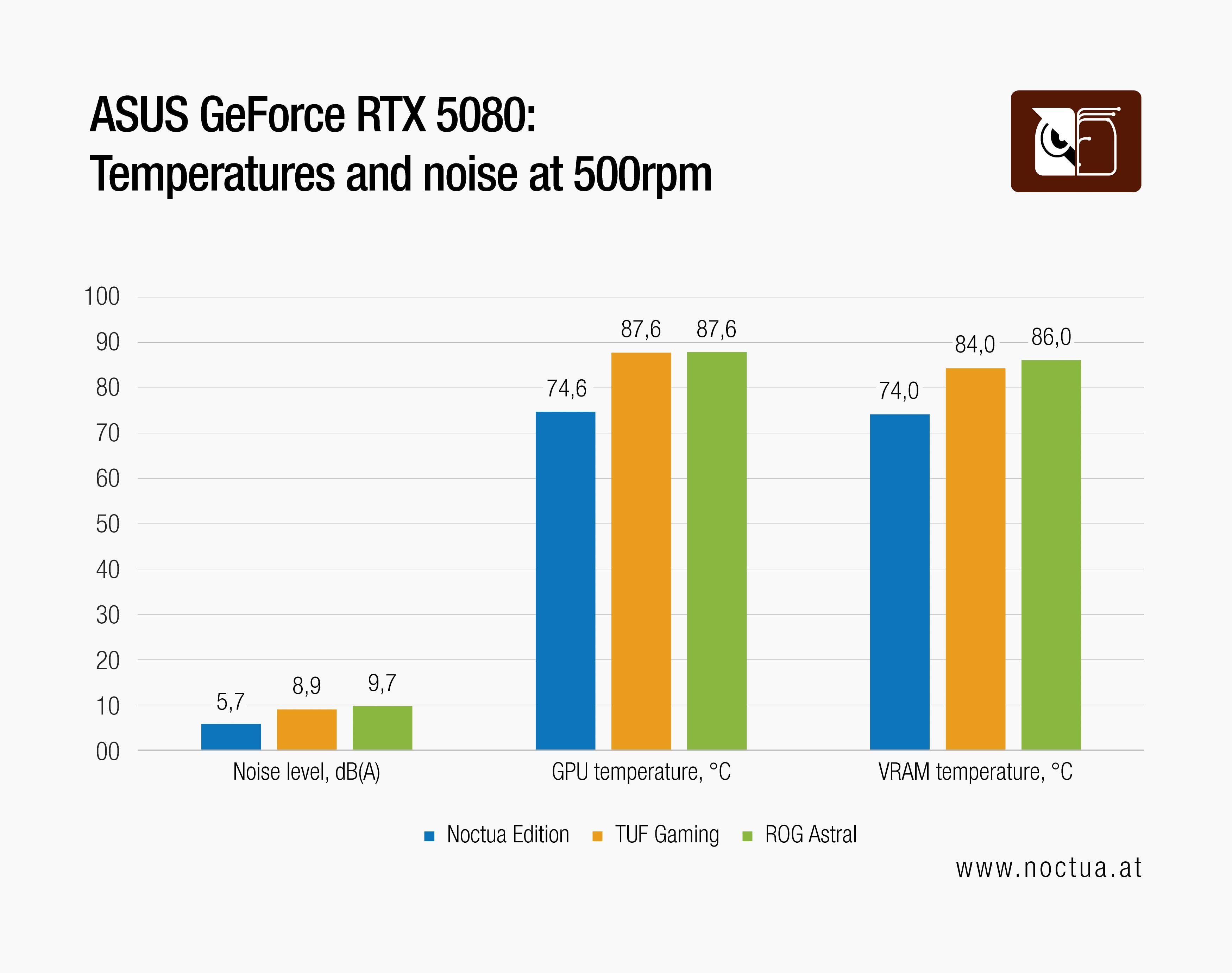 In a more extreme test setup, the graphics cards were forced to run their fans at only 500 RPM. In this case, all three cards are operated at extremely quiet noise levels, staying below 10 dB(A). While all are nearly inaudible, the Noctua Edition still maintains an edge.