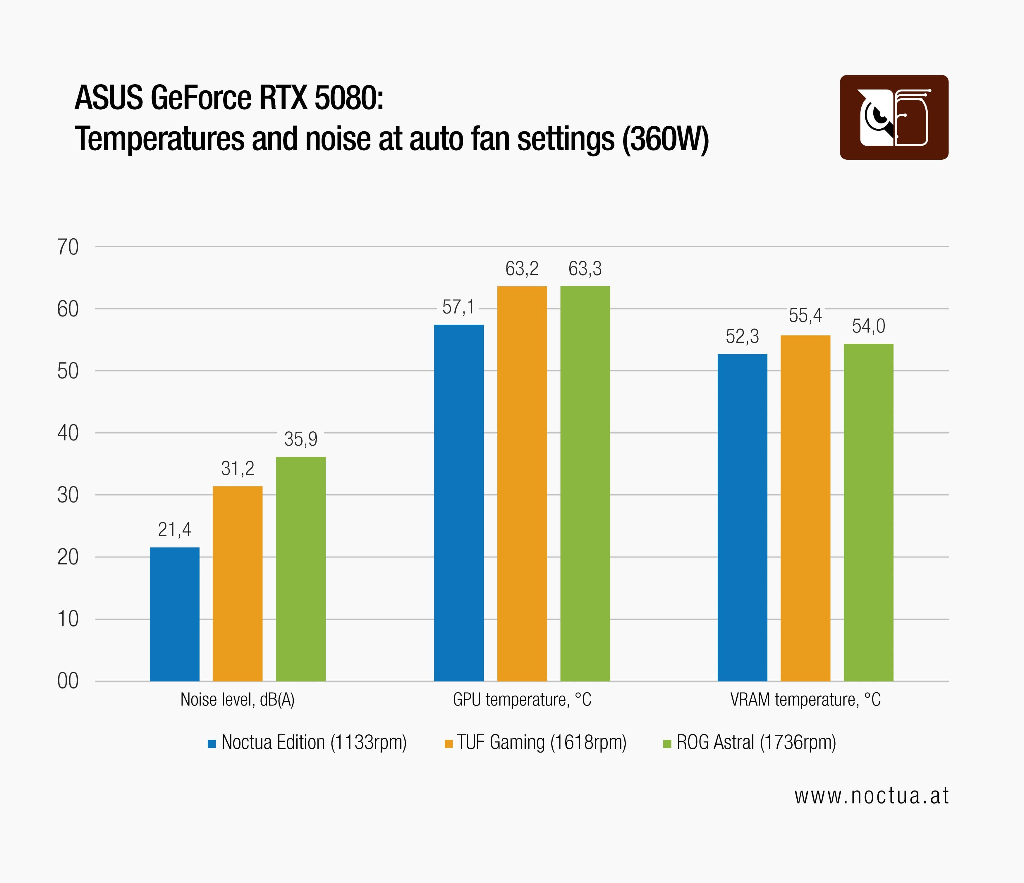 In extensive internal testing, the ASUS GeForce RTX 5080 Noctua Edition was rigorously evaluated against its ASUS TUF Gaming and ROG Astral counterparts. The GPUs were set to a 360W power target and subjected to thermal stress tests using FurMark in 4K resolution. The results demonstrate the Noctua Edition's superior performance, achieving an impressive balance between low noise levels and outstanding cooling efficiency.