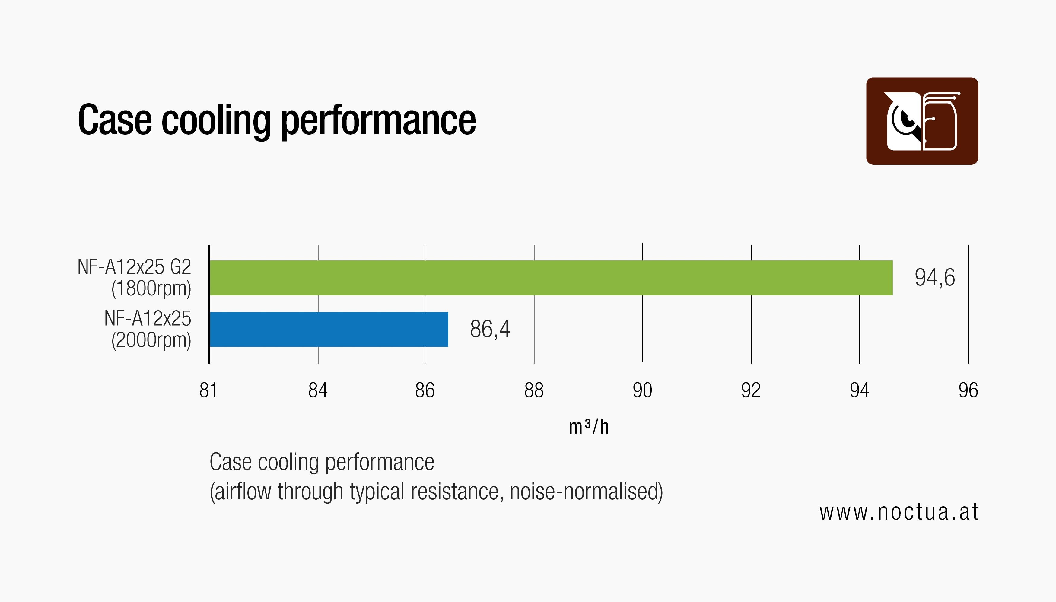 As with heatsinks and radiators, the superior case cooling performance of the G2 fan can also be converted into a decisive noise level advantage: In order to achieve the same levels of airflow through a chassis as the first-generation NF-A12x25, the G2 version can be run at significantly lower RPM speeds, which will result in a typical ~1-2dB(A) improvement in noise levels.