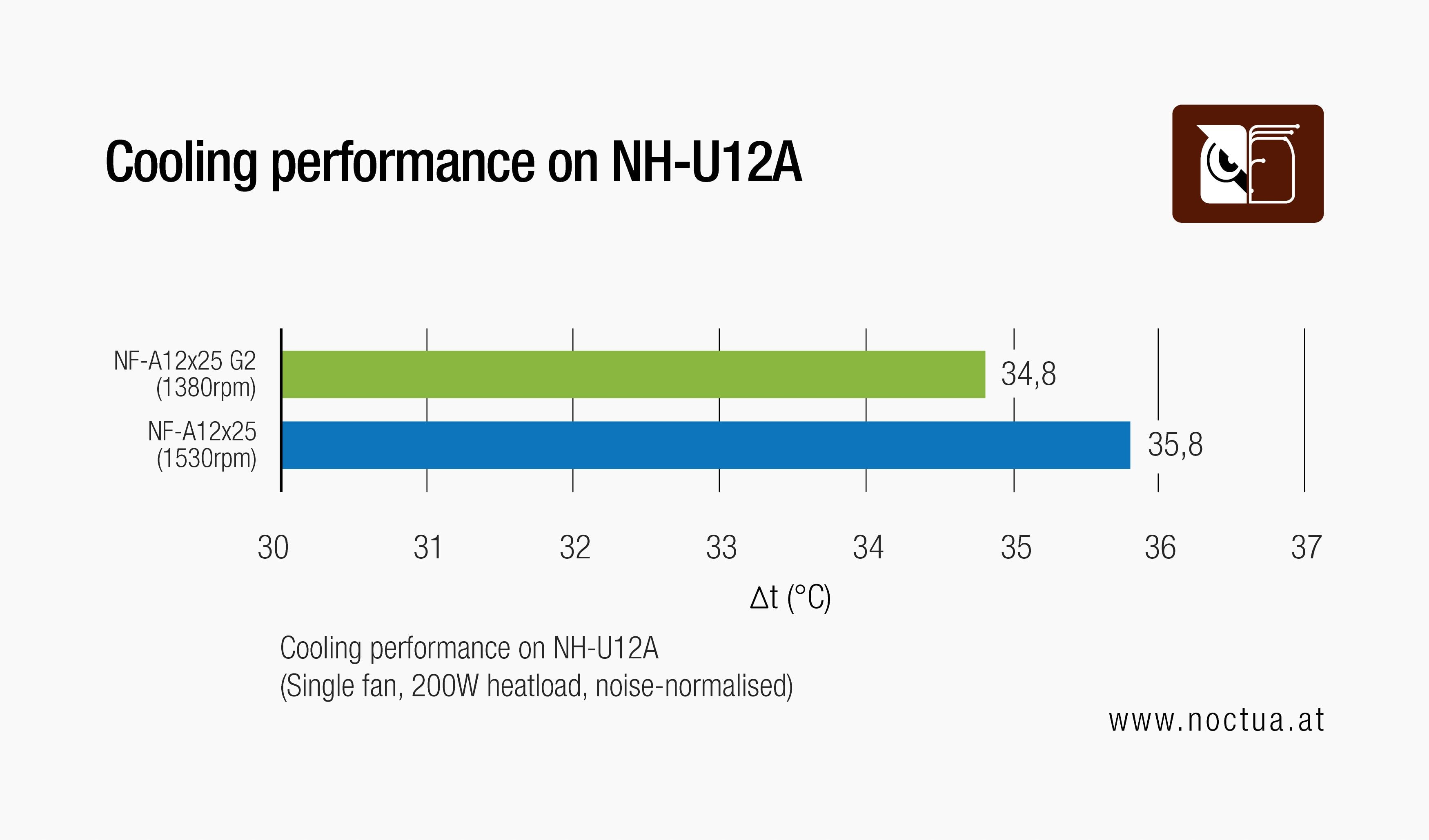 Tested on an NH-U12A heatsink at a heatload of 200W, the NF-A12x25 G2 can provide temperature gains of around 1°C while running at the same noise level as its predecessor:
