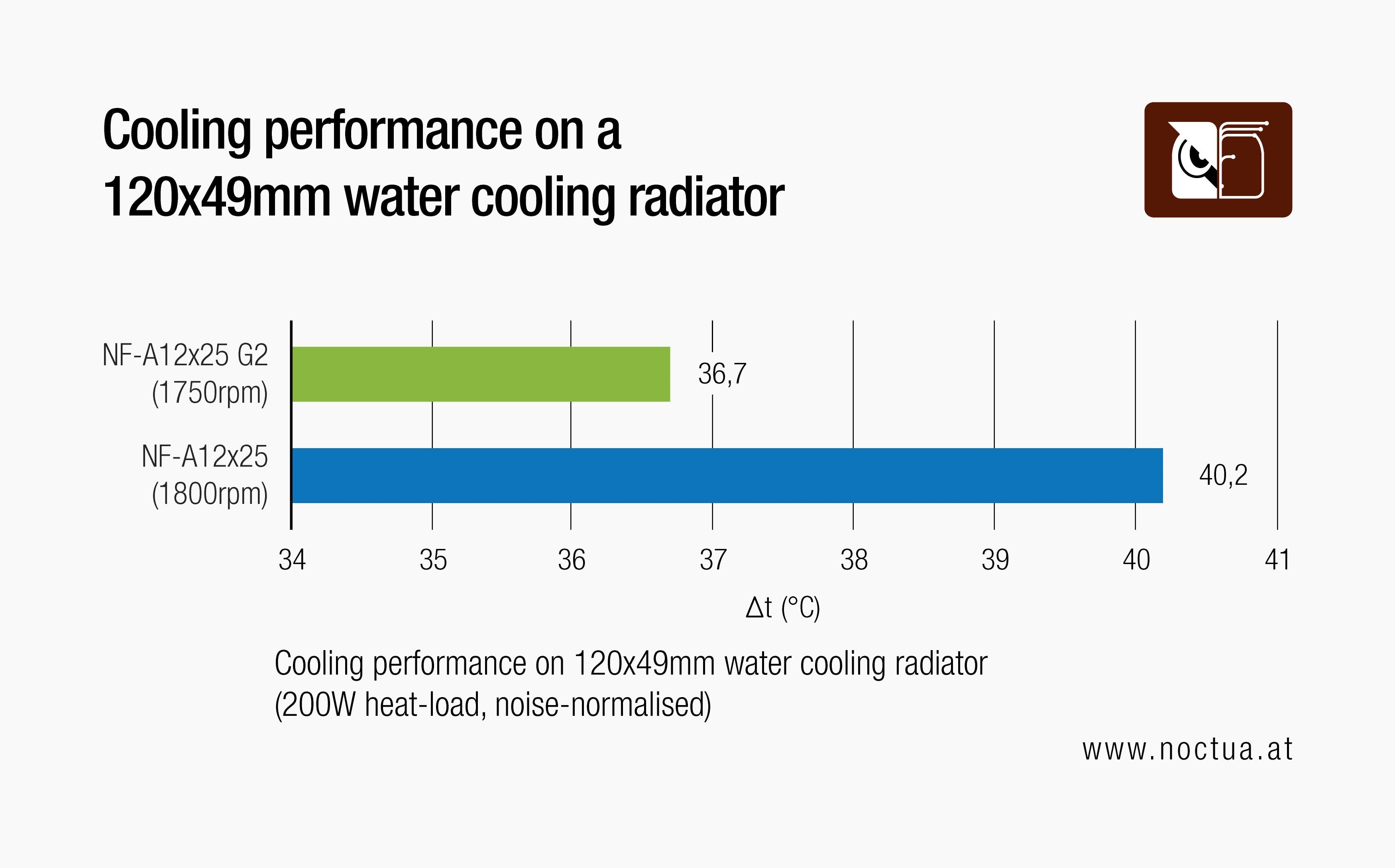 In real world testing, the performance gains of the NF-A12x25 G2 over its predecessor are particularly significant on water cooling radiators. With both fans adjusted to the same on-application noise level on a highly restrictive 120x49mm radiator, the NF-A12x25 G2 beats its award-winning predecessor by 3.5°C at a heatload of 200W: