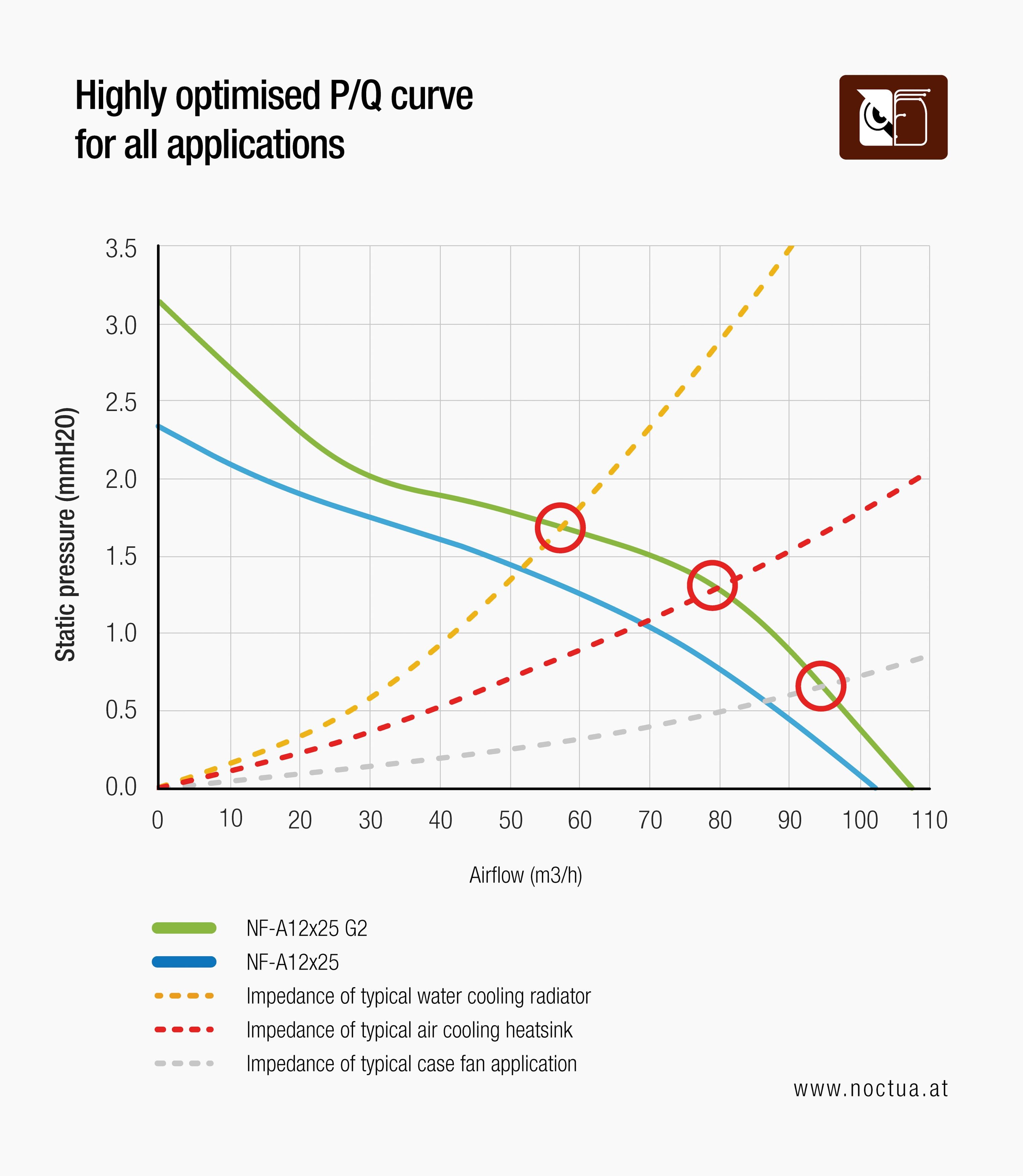 As can be seen from the following P/Q chart, the NF-A12x25 G2 outperforms its predecessor in the entire spectrum from low-impedance, airflow demanding applications all the way to high-impedance, pressure demanding configurations: