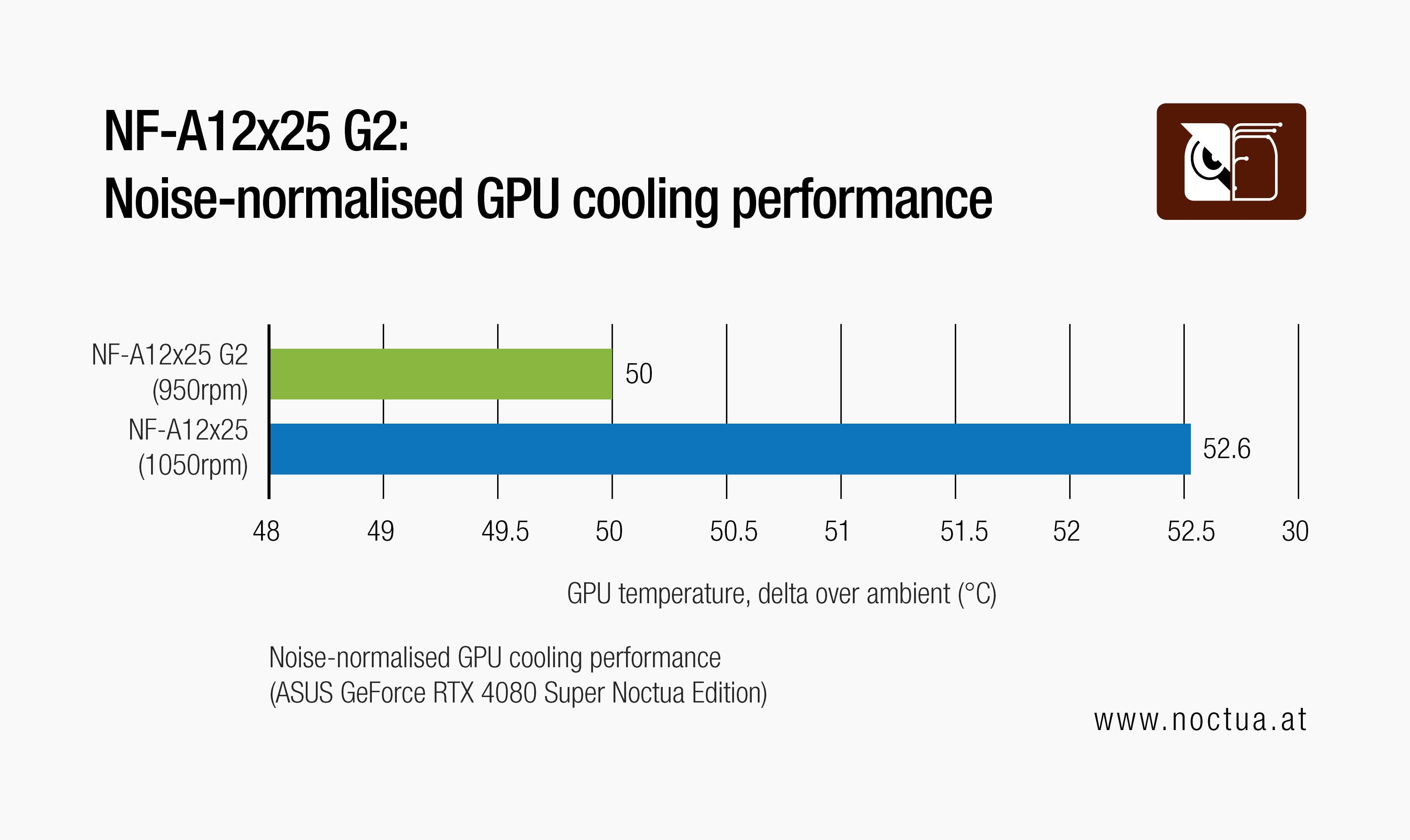 In the early stages of testing and development for the upcoming ASUS GeForce RTX 5080 Noctua Edition graphics card, the first-generation NF-A12x25 fan was directly compared to the G2 version. Noise-normalised GPU cooling performance tests were conducted using the previous-generation ASUS GeForce RTX 4080 Super Noctua Edition GPU and two units of each fan model, where the NF-A12x25 G2 fans demonstrated superior performance, achieving a 2.6°C reduction in GPU core temperature. This confirmed the NF-A12x25 G2 as the optimal choice for integration into the next-generation RTX 5080 Noctua Edition graphics card.