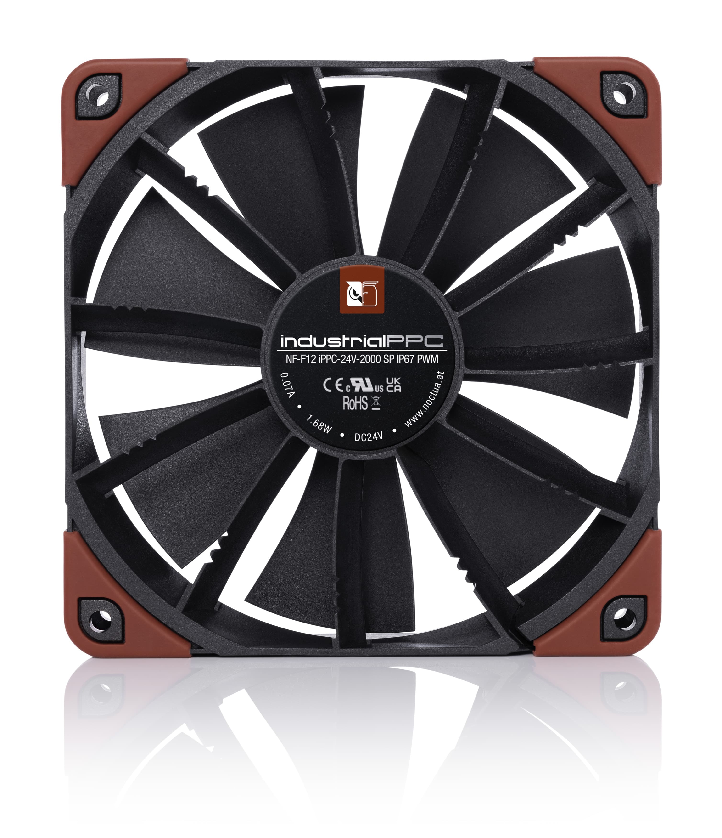 Thanks to its elevated 2000rpm top speed, the NF-F12 industrialPPC-2000 provides a significant performance boost over the 1500rpm retail version. Combined with the industrialPPC series' robust polyamide construction and advanced protection features, this makes the fan ideal for challenging industrial applications.