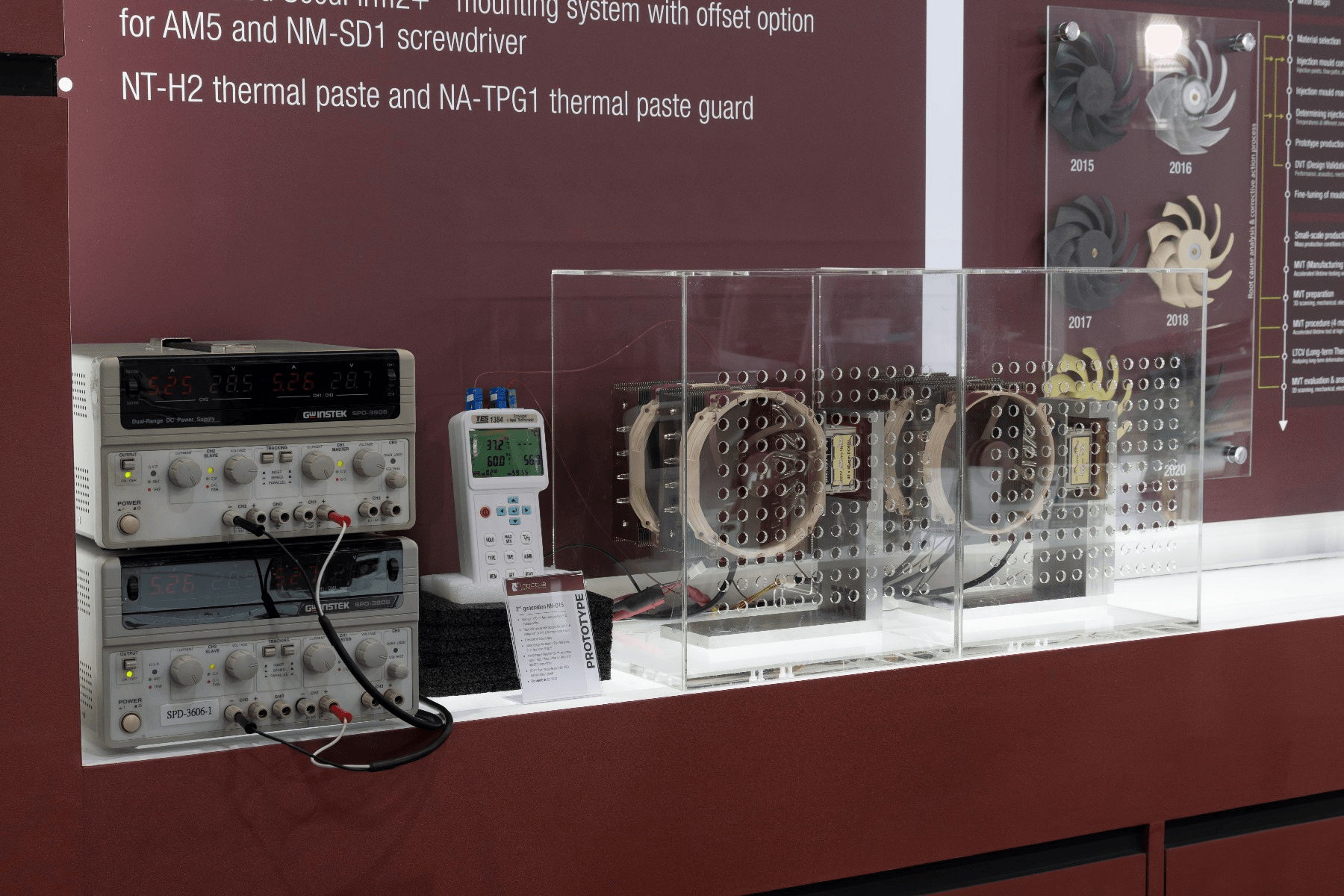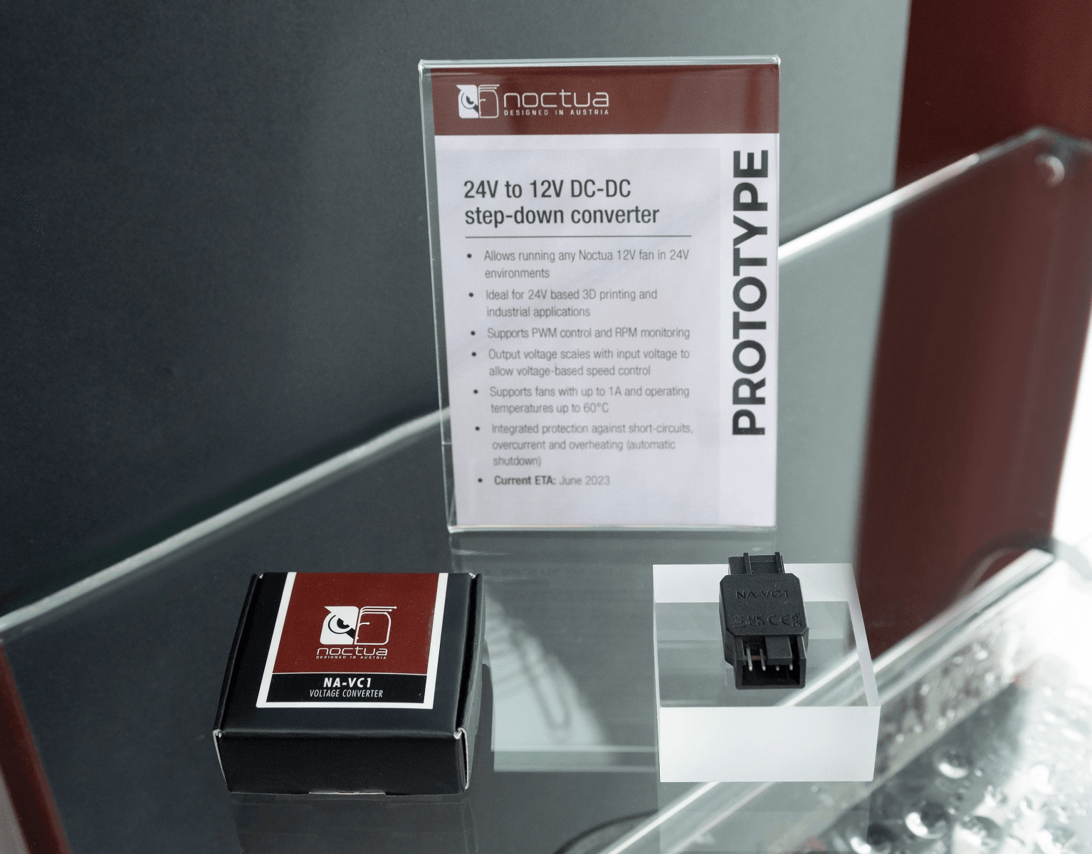 Both the new 24V version of NF-A4x10 and the new slim 60mm fan have been shown in their final production versions and should be ready for release in Q4 this year. Last but not least, the long-awaited 24V-to-12V step-down converter was on display again and will be released later this month.