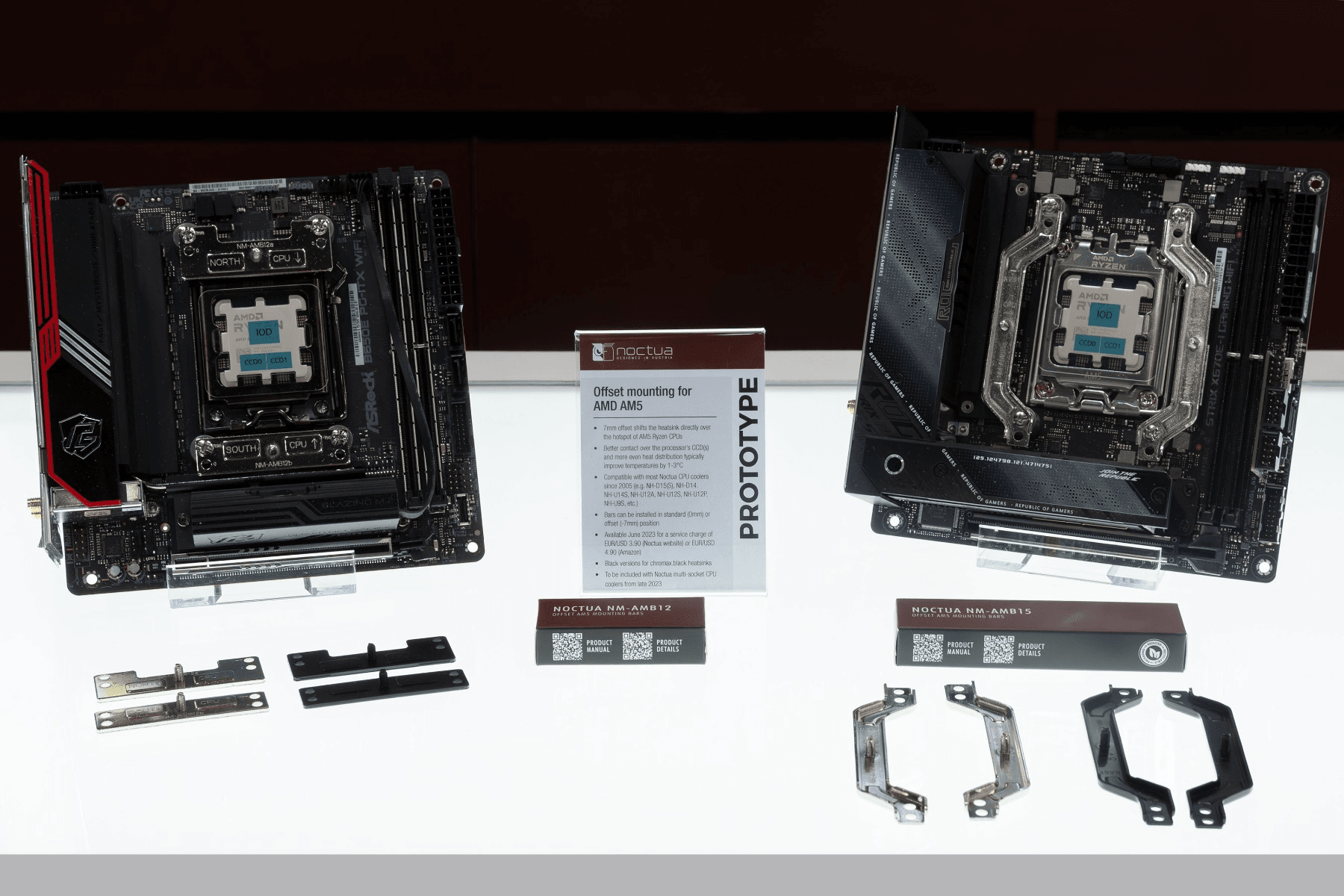 Since it will utilise the next-gen 140mm fan, the timeline for the second generation of the award-winning NH-D15 CPU cooler depends on the timeline for the fan and targets a Q2 release if there are no further delays with the fan. Thanks to the new fan’s superior P/Q performance, Noctua could reduce the heatsink’s fin pitch from 1.9 to 1.6mm, increasing its surface area by 20% without increasing the size. This plus the increase from 6 to 8 heatpipes are the keys to the new generation’s superior performance: The on-site live demonstration at a heatload of 300W illustrated an improvement of around 3-3.5°C. While the next gen 140mm fan and NH-D15 cooler won’t be on the market before next year, Noctua’s new offset mounting bars for AMD AM5 processors will be released in mid-June: By offsetting the heatsink 7mm towards the south side of the socket, more pressure is applied right above the CPU’s CCD(s). This improved contact exactly at the processor’s hotspot can significantly reduce CPU temperatures with typical improvements in the range of 1-3°C. The new offset mounting bars will be available via Noctua’s website or Amazon for a service charge of EUR 3.90 (website form) or EUR/USD 4.90 (Amazon) that helps to cover parts of the shipping and handling costs.