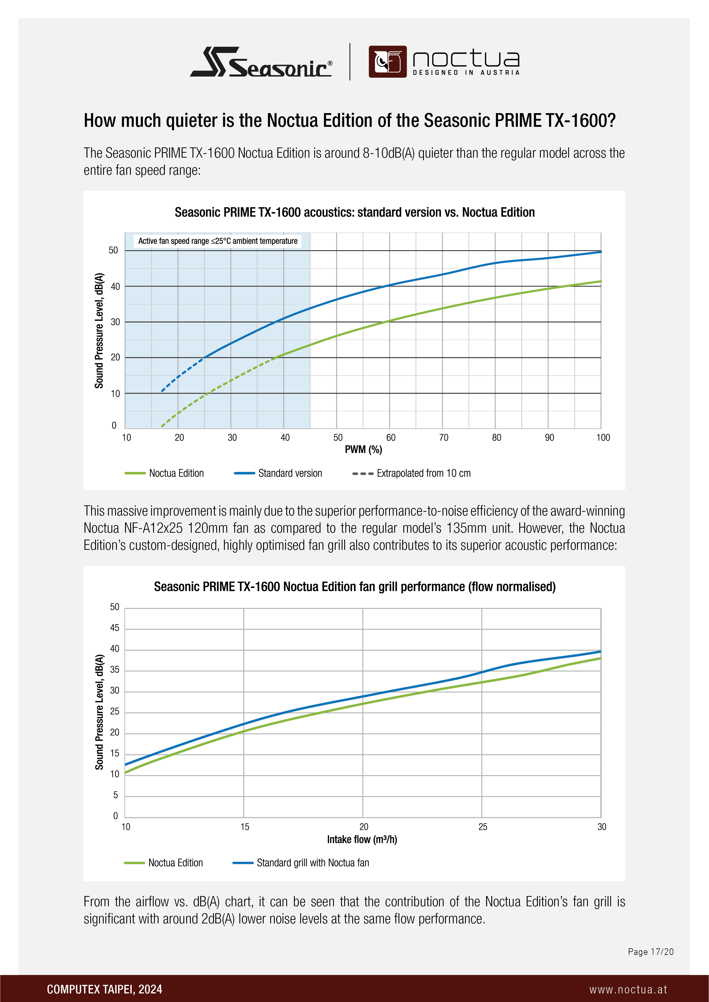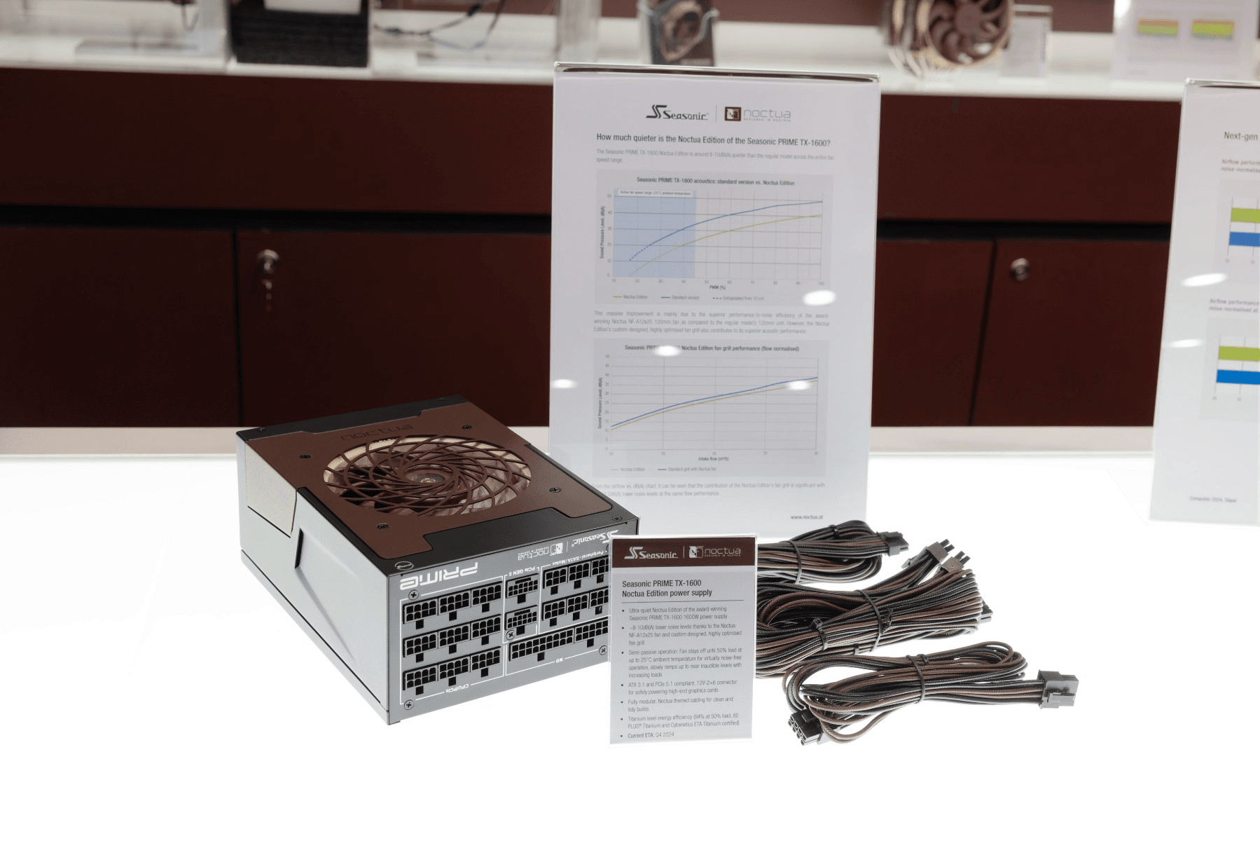 Another highlight of the show was the upcoming Noctua Edition of Seasonic’s award-winning Prime TX-1600 power supply: Using a Noctua NF-A12x25 120mm fan as well as a custom engineered fan grill that reduces turbulences in order to enhance both airflow and acoustics, the Noctua Edition can run ~8-10dB(A) quieter than the already quiet standard version. The Seasonic Prime TX-1600 Noctua Edition is currently scheduled for a Q4 2024 release.