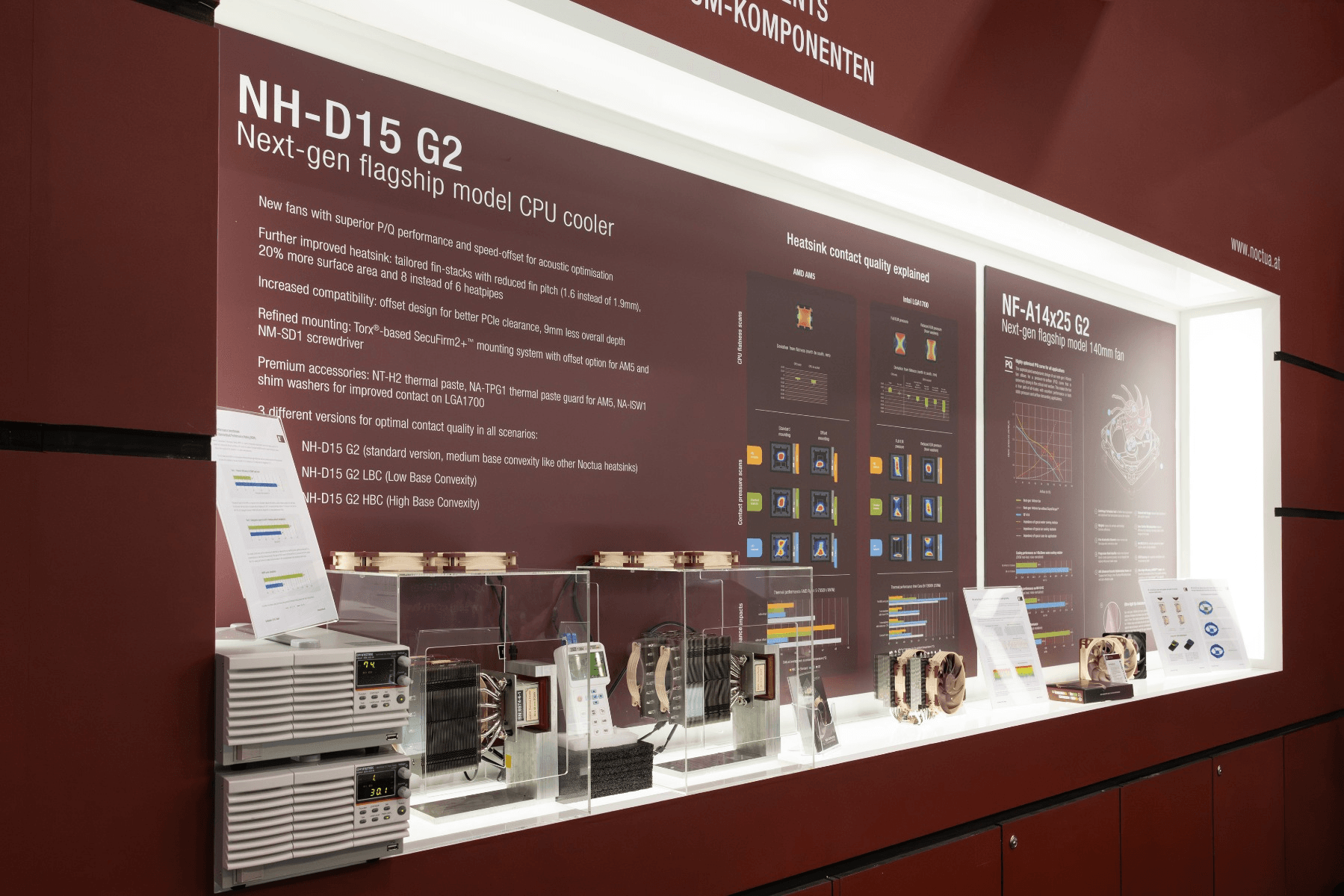 The upcoming second generations of the iconic NH-D15 CPU cooler and NF-A14 140mm fan were at the heart of Noctua’s Computex 2024 line-up. After further reinforcements of the frame structure, the round-frame version of the fan as well as the NH-D15 G2 are now in mass production. The NH-D15 G2 will be available in three different versions: A standard version that has the same medium base convexity as other Noctua multi-socket coolers, a low base convexity (LBC) version as well as a high base convexity (HBC) version. The background of this differentiation is the drastically different contact surface flatness and hotspot location of AMD’s AM5 and Intel’s LGA1700 platforms, as Noctua illustrated using 3D scans and contact pressure maps: Whereas AM5 processors are relatively flat and have their hotspot location towards the south side of the socket, Intel LGA1700 CPUs become strongly concave due to pressure from the Internal Loading Mechanism (ILM) unless shim washers or so called contact frames are used to reduce ILM pressure.