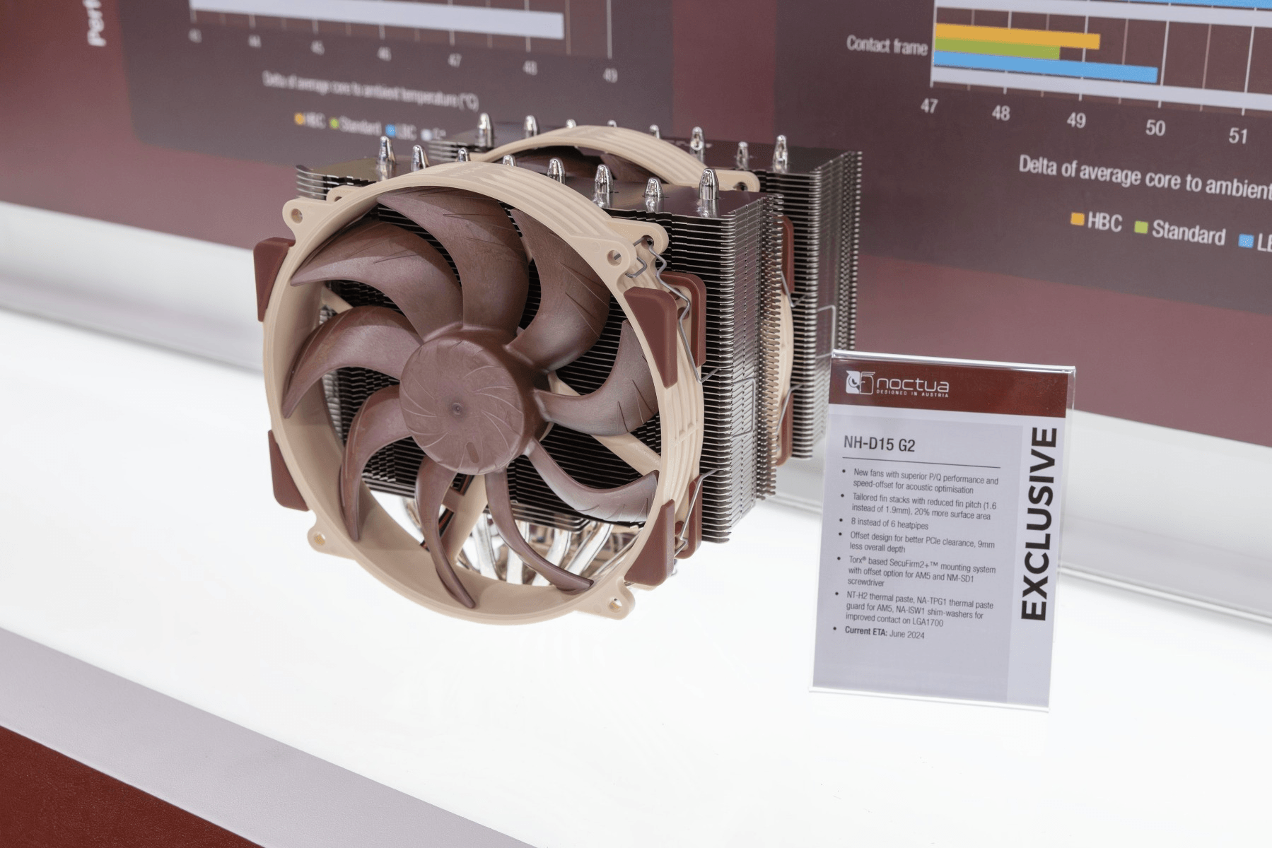 In a live on-site demonstration, the NH-D15 G2 was capable of dissipating more than 600W on a standardised synthetic heating element with a maximum temperature of ~60°C whereas the first-generation NH-D15 could only support around 430W in the same setting. On modern AMD and Intel CPUs with 180-250W heat-loads, this performance advantage will typically translate into a 2-3°C temperature reduction.