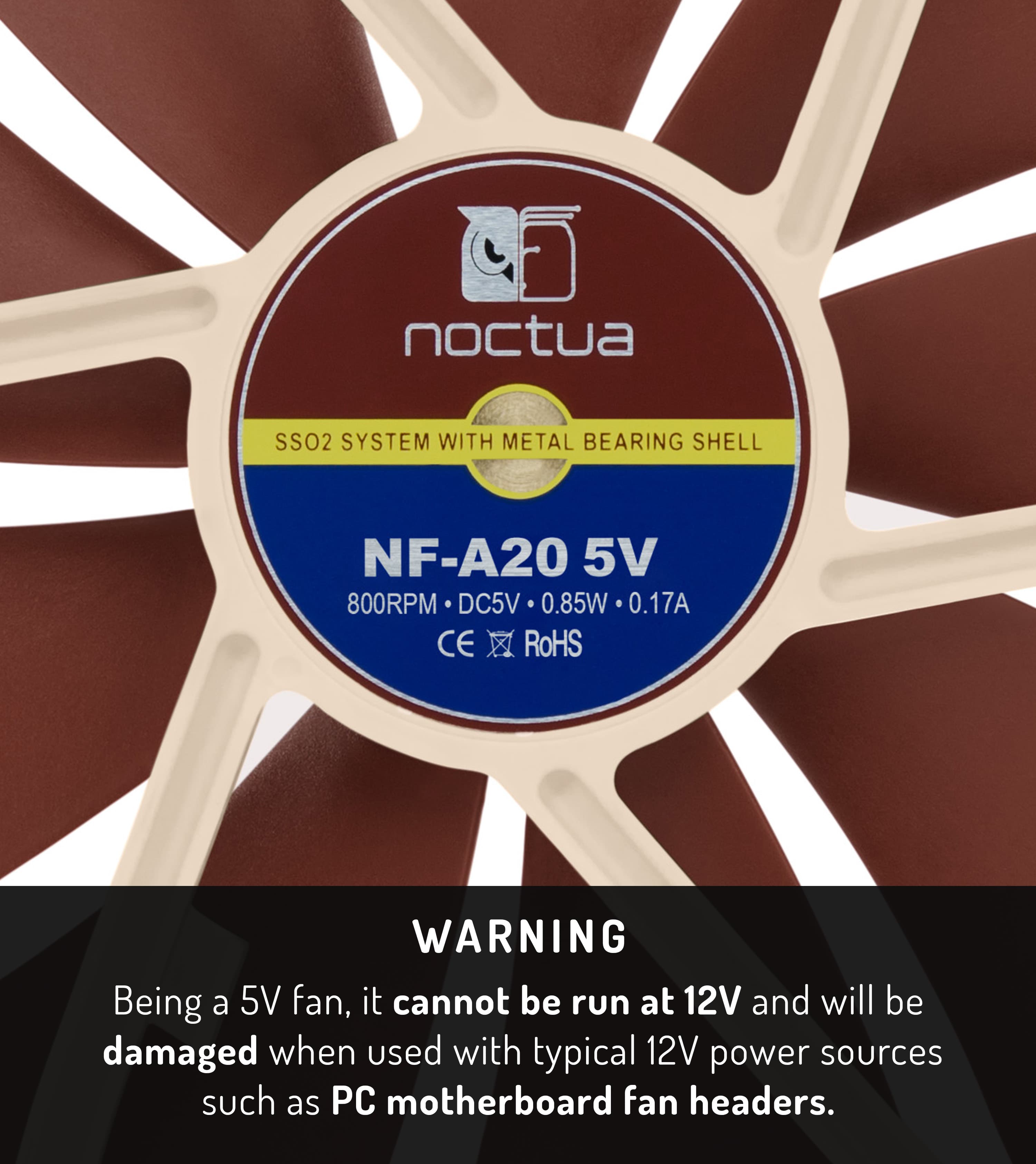 5V fans are used in various devices and applications. With the included USB power adaptor cable and OmniJoin™ adaptor set, the NF-A20 5V is a proven premium solution that gives you full flexibility both for replacing existing 5V fans and for new, custom applications.