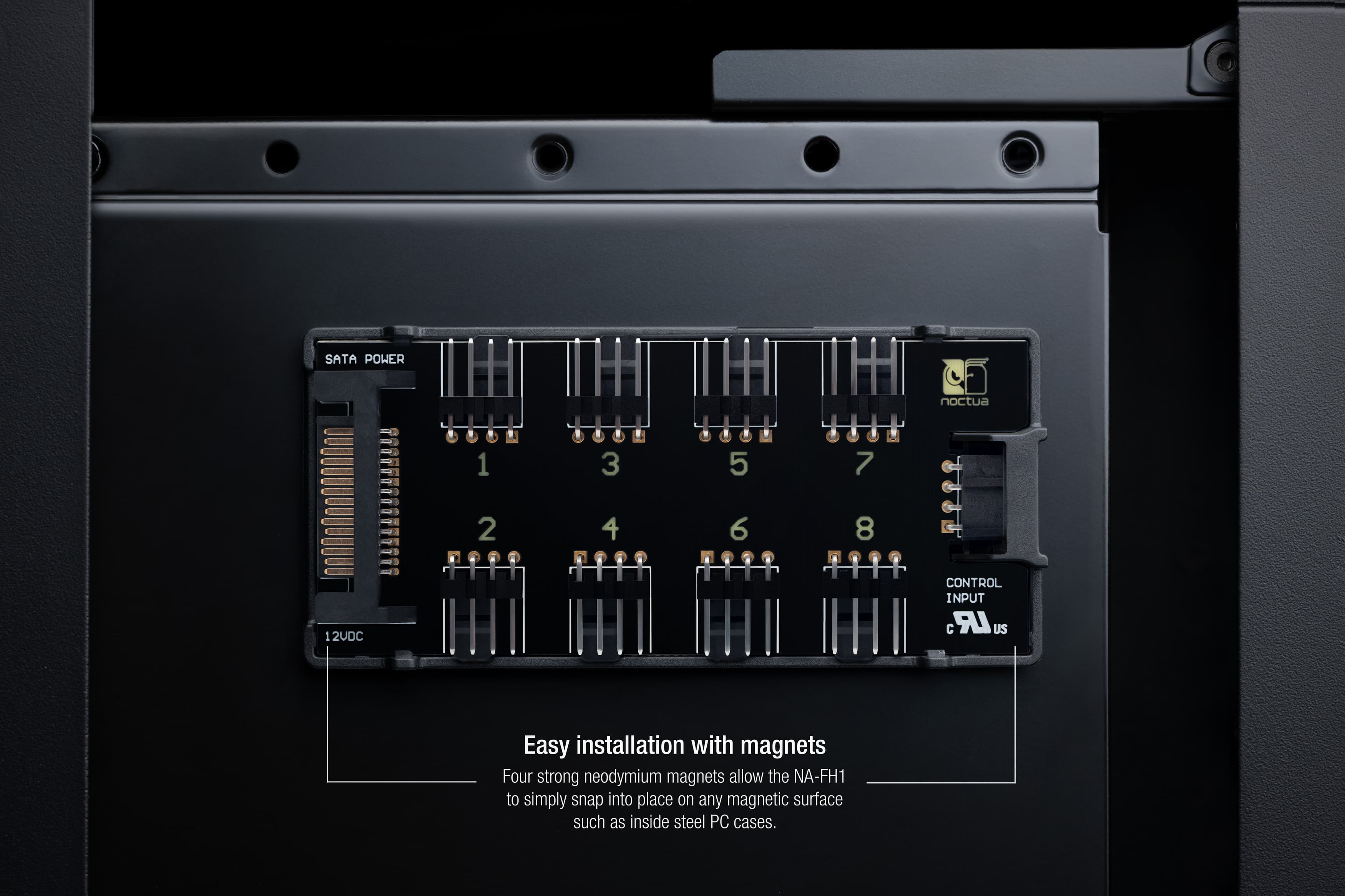 The NA-FH1 features four strong neodymium magnets on the rear side, which allows it to simply snap into place on any magnetic surface such as inside steel PC cases. On non-magnetic surfaces such as aluminum PC cases, the flat rear side of the device makes it possible to easily fix it with double-sided tape or velcro tape.