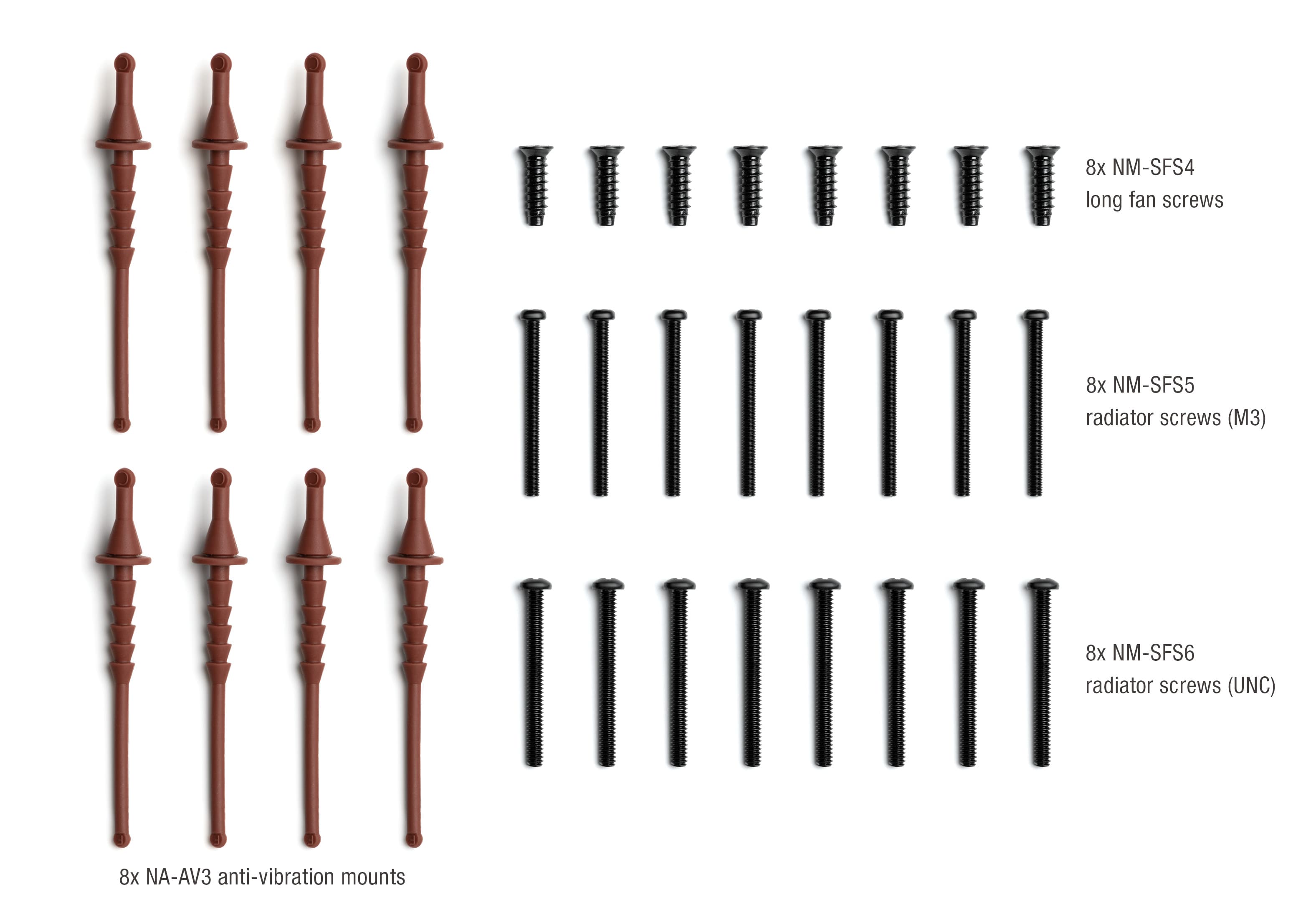 For use with case intake fans, the NA-IS1-14 Sx2 contains eight long self-tapping fan screws and eight NA-AV3 silicone anti-vibration mounts for tool-free, vibration-proof installation. Both the screws and the anti-vibration mounts simply go through the holes in the spacer and attach to the fan, sandwiching the spacer between the fan and the case.