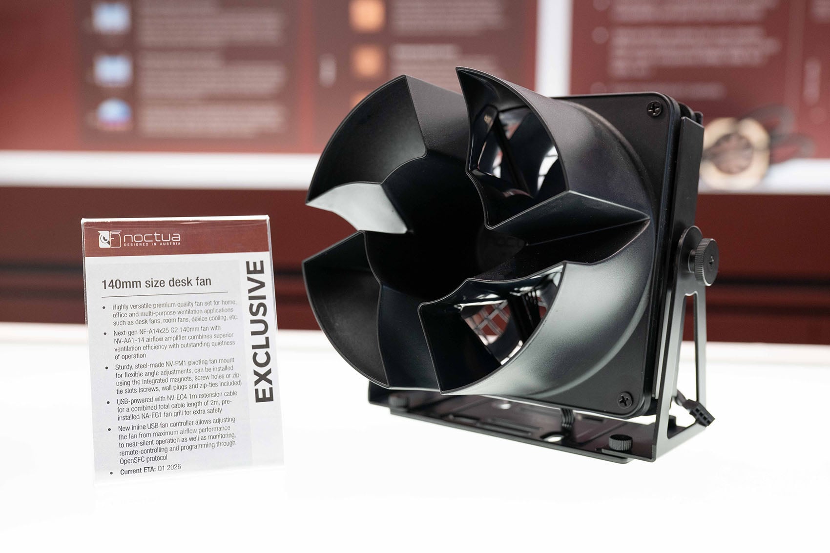 Another highlight of the show was the update on the development of the two-phase thermosiphon CPU cooler, engineered in collaboration with the Belgian two-phase cooling specialist Calyos. Leveraging the latent heat potential of vaporisation and condensation, the goal of this project is to provide the same performance level and ease of use as all-in-one water coolers without their drawbacks. The showcased prototype included a small window on the evaporator housing, allowing the working fluid to be observed in action as it cooled a modern AMD Ryzen 7 9800X3D CPU running an F1® 24 gameplay demo. The demonstration also highlighted the challenges of developing such a product for the market, including hotspot-centric heat loads generated by CPUs and the dry-out effect this causes on the evaporator plate. Significant progress has been made in development since last year and Noctua remains fully committed to delivering this product to market. However, it will not be featured in the public roadmap, and no estimated release date will be provided until definitive timelines are determined.