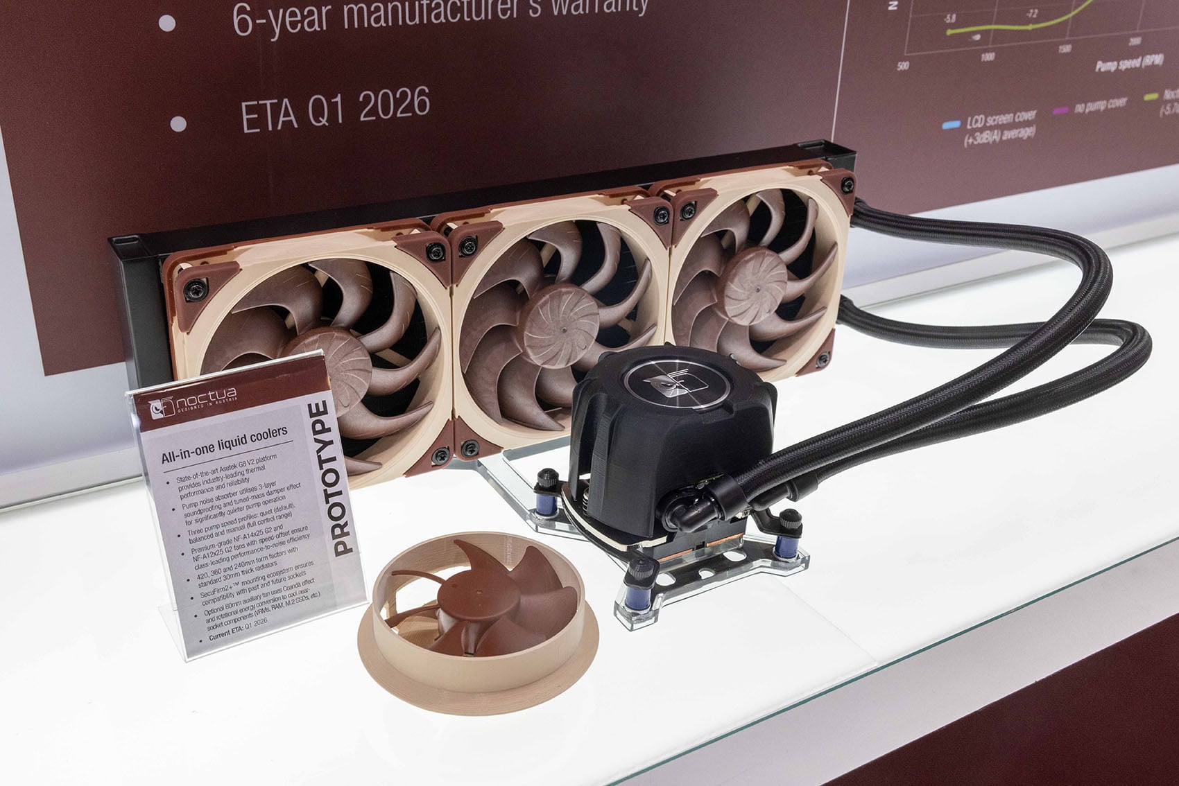 Noctua also unveiled its first prototype of an All-In-One (AIO) CPU liquid cooler with a 360mm radiator. The cooler is based on Asetek’s EMMA (Gen 8) V2 platform, which offers chart-topping performance and industry-leading reliability. Distinguishing this as a true Noctua product are the premium quality quiet NF-A12x25 G2 fans with a speed offset that helps to avoid periodic humming due to beat frequencies, the SecuFirm2+™ mounting ecosystem that ensures compatibility with past and future sockets, and a pump cover engineered to minimise vibrations and noise through a multi-layered acoustic design. Two layers of open-pore soft acoustic foam target high-frequency noise, while a dense foam layer in between serves as a mass barrier, attenuating low-frequency noise. Additionally, the pump’s top cover is mounted on floating silicone inserts to prevent vibration transfer. Together, these elements function as a tuned-mass damper (TMD) with the dense acoustic barrier and outer cover shell serving as the mass nodes. In contrast, the soft acoustic foam and silicone inserts provide the spring and damping functionality of the TMD. The prototype also featured an optional 80mm fan that can be placed on top of the cover using magnets, utilising the Coandă effect and rotational energy conversion to cool nearby socket components (VRMs, RAM, M.2 SSDs, etc.). The plan is to bring these AIOs to the market in the 420, 360 and 240mm form factors with standard 30mm thick radiators with an expected release date in Q1 2026.