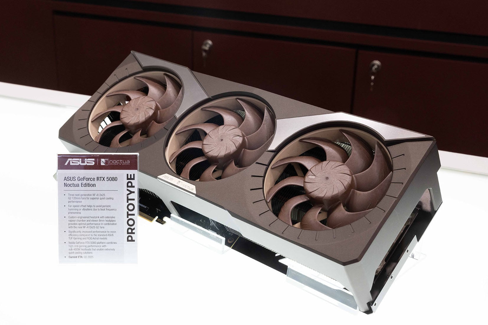 The highly anticipated ASUS GeForce RTX 5080 Noctua Edition was also unveiled, featuring not two, but three next-generation NF-A12x25 G2 fans mounted on a custom-engineered heatsink. This design incorporates an extensive vapour chamber and a total of eleven heatpipes, seven measuring 8mm and four measuring 6mm. The PCB is based on the TUF Gaming model, and the upgraded cooling system significantly enhances performance-to-noise efficiency compared to both the TUF Gaming and ROG Astral cards. The card occupies 4 slots (80mm), with dimensions of 385mm in length and 151mm in width, weighing in at 2.6kg. The graphics card is expected to be released in Q3 2025.
