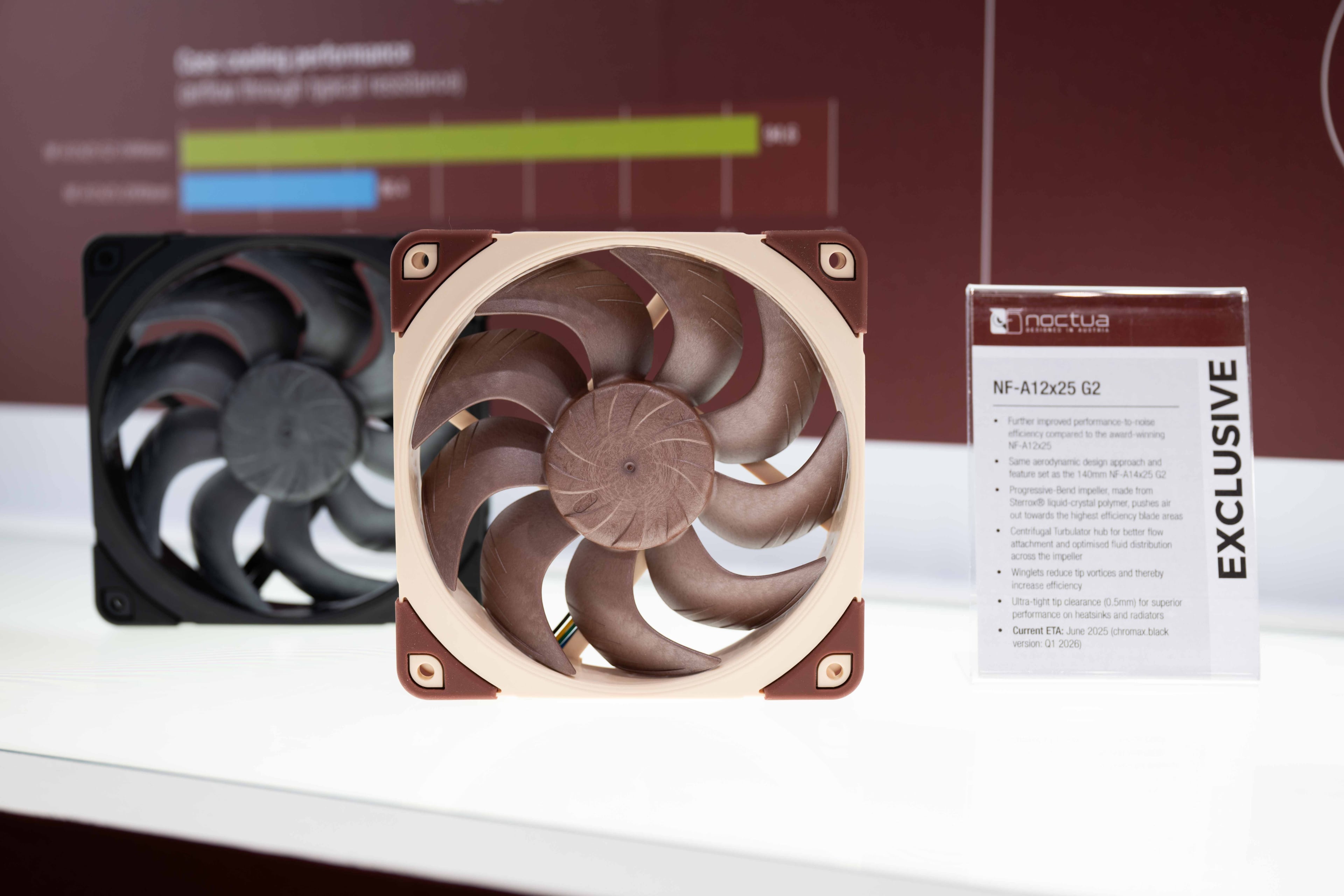 Among a broad range of exclusive products and prototypes, the next-generation 120mm NF-A12x25 G2 fan took centre stage, serving as a key component in many of the showcased items. Featuring enhanced performance-to-noise efficiency, the fan incorporates a new Progressive-Bend impeller design made from Sterrox® liquid-crystal polymer. This design pushes air out towards the highest efficiency blade areas, while the Centrifugal Turbulator hub improves flow attachment and optimises fluid distribution across the impeller. These innovations make the fan highly versatile, delivering exceptional performance in both static pressure and airflow-intensive applications. Internal testing revealed improvements of up to 3.5°C on a 120 by 49mm liquid cooling radiator with a 200W heat load, compared to the award-winning NF-A12x25 in noise-normalised conditions. The NF-A12x25 G2 is slated for release in June 2025, with the chromax.black version expected to launch in Q1 2026.