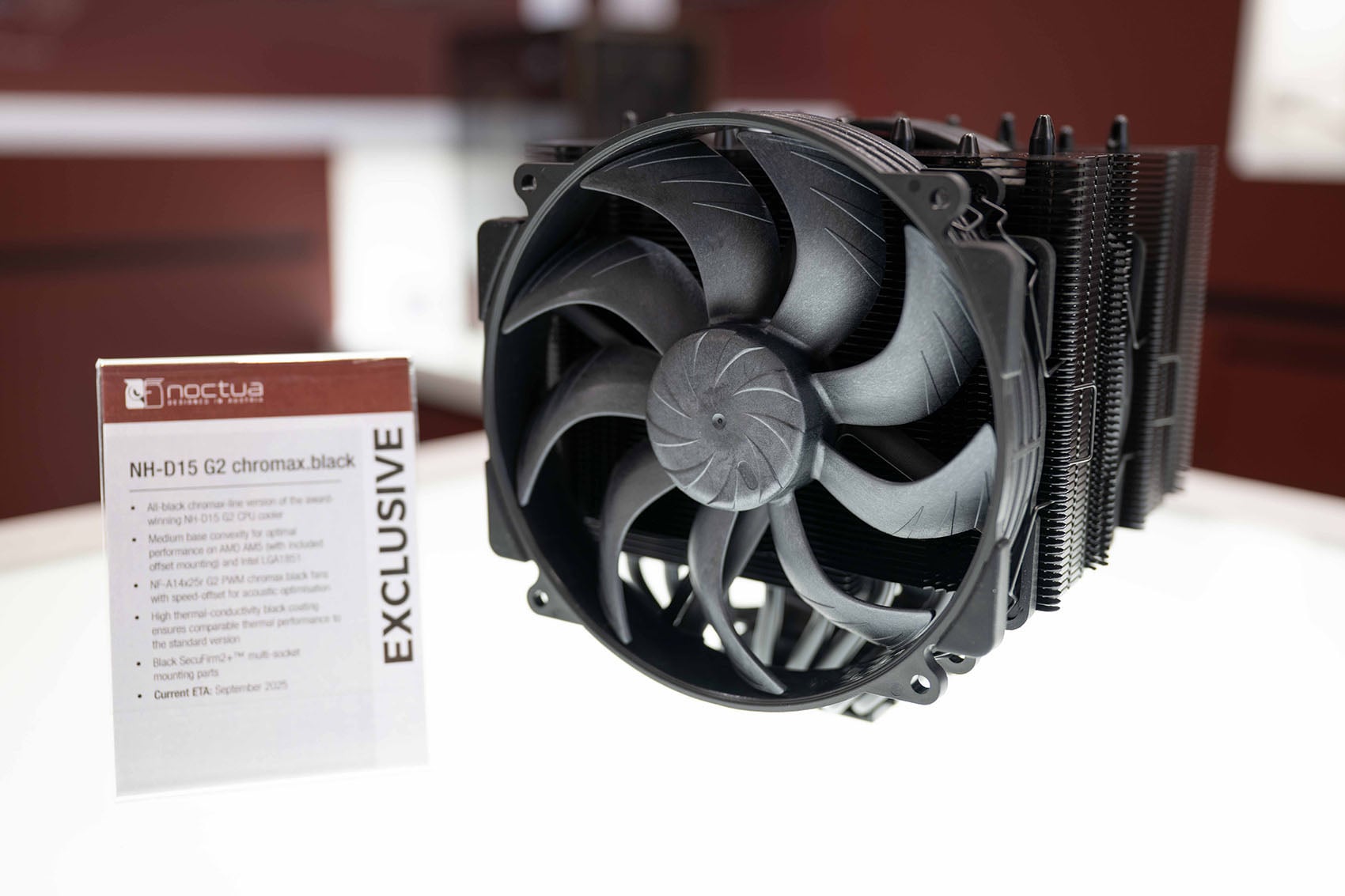 All-black counterparts of the award-winning NH-D15 G2 CPU cooler and NF-A14x25(r) G2 140mm fans were also showcased, signalling their arrival in September 2025. The high thermal-conductivity black coating on the heatsink guarantees thermal performance comparable to the standard version of the cooler and will be available exclusively in the standard, medium base convexity version, excluding the LBC and HBC models.