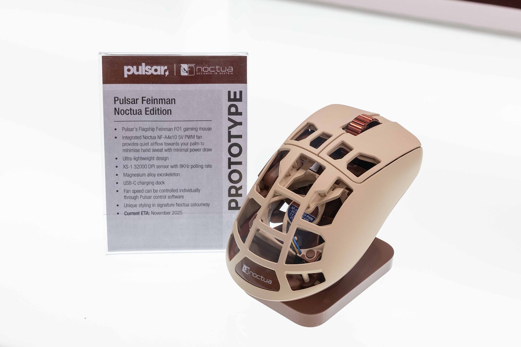 One of the most eye-catching products on display was the planned collaboration project with Pulsar, a high-end gaming peripheral brand well-known in the esports landscape. The project centres around their flagship Feinman FO1 gaming mouse, which features an ultra-lightweight design built with a magnesium alloy exoskeleton that houses an XS-1 32,000 DPI sensor with an 8KHz polling rate. In addition to the unique styling in the signature Noctua colourway, the mouse incorporates a highly energy-efficient Noctua NF-A4x10 5V PWM fan with minimal power consumption, providing quiet airflow to the palm, reducing hand sweat and improving grip during intense gaming sessions. The current estimated release date from Pulsar is November 2025.