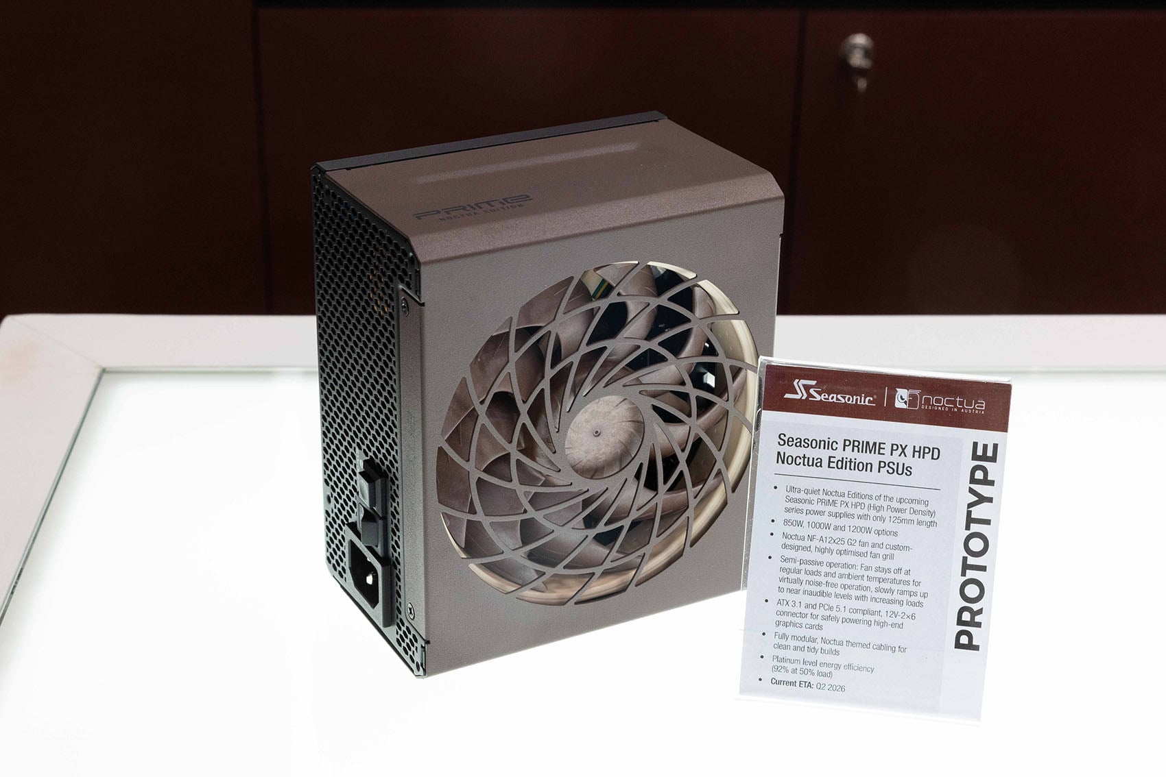 Following the success of the first ultra-quiet Seasonic Noctua Edition power supply, the next generation PRIME PX HPD (High Power Density) models are already in development. This new lineup of Platinum energy efficiency power supplies, offering 92% efficiency at 50% load, is set to launch in 850W, 1000W, and 1200W variants. All of them will feature a remarkably compact design, measuring just 125mm in length. The new series will incorporate the upcoming NF-A12x25 G2 fan alongside the custom-engineered, highly optimised fan grill that was introduced with the TX-1600 Noctua Edition model. With semi-passive operation, the fan remains off during typical loads and ambient temperatures, ensuring virtually silent performance, and activates only as load levels increase. Additional features include compliance with ATX 3.1 and PCIe 5.1 standards, 12V-2×6 connectors for high-end graphics cards, and fully modular cables with Noctua's signature colourway. The Noctua Edition Seasonic PRIME PX HPD series is scheduled for release in Q2 2026.