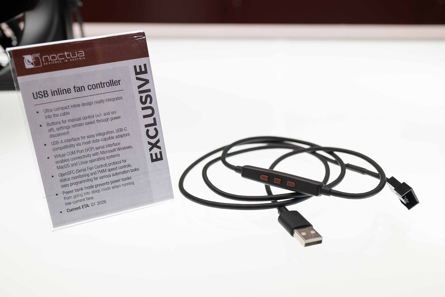The Noctua HOME product line is also set to undergo an expansion with the introduction of a 140mm desk fan, featuring the next-generation NF-A14x25 G2 fan paired with the NV-AA1-14 airflow amplifier. This combination delivers exceptional ventilation efficiency while maintaining remarkably quiet operation. The product will retain its sturdy, steel-constructed NV-FM1 pivoting fan mount, which allows flexible angle adjustments and the included integrated magnets, screw holes, and zip-tie slots offer versatile mounting options. The new fan will be USB-powered and the package will come with an NV-EC4 1m extension cable, providing a total cable length of 2m, along with a pre-installed NA-FG1 fan grill for added safety. Additionally, the new inline USB fan controller cable enables users to adjust the fan from maximum airflow performance to near-silent operation using physical buttons and it also supports monitoring, controlling, and programming through the Virtual COM Port (VCP) serial interface, ensuring compatibility with Microsoft Windows, macOS, and Linux operating systems. The inline USB fan controller extension cable will also be available as a standalone product within the Noctua HOME product line.
