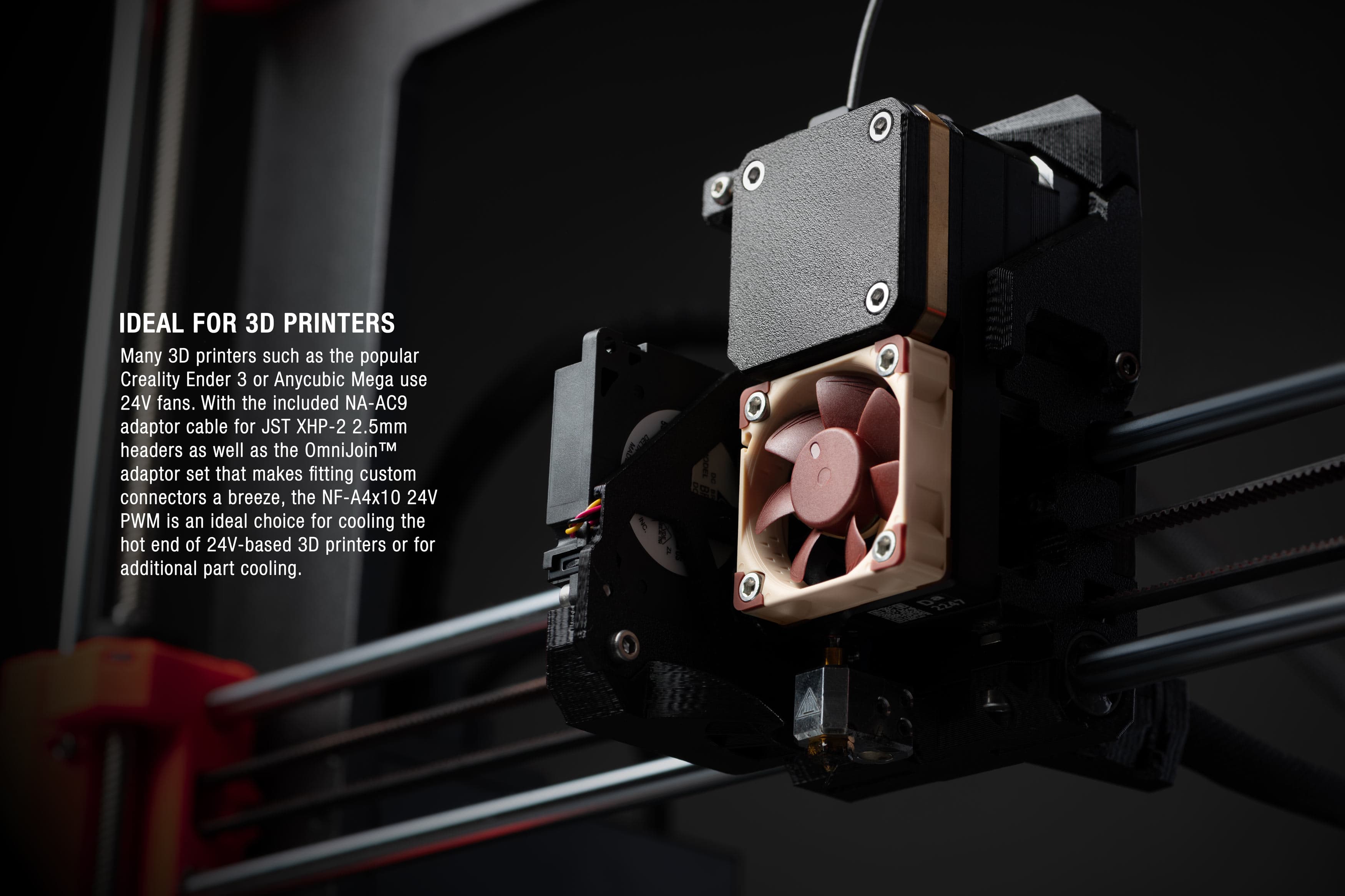 Many 3D printers such as the popular Creality Ender 3 or Anycubic Mega use 24V fans. With the included NA-AC9 adaptor cable for JST XHP-2 2.5mm headers as well as the OmniJoin™ adaptor set that makes fitting custom connectors a breeze, the NF-A4x10 24V PWM is an ideal choice for cooling the hot end of 24V-based 3D printers or for additional part cooling.