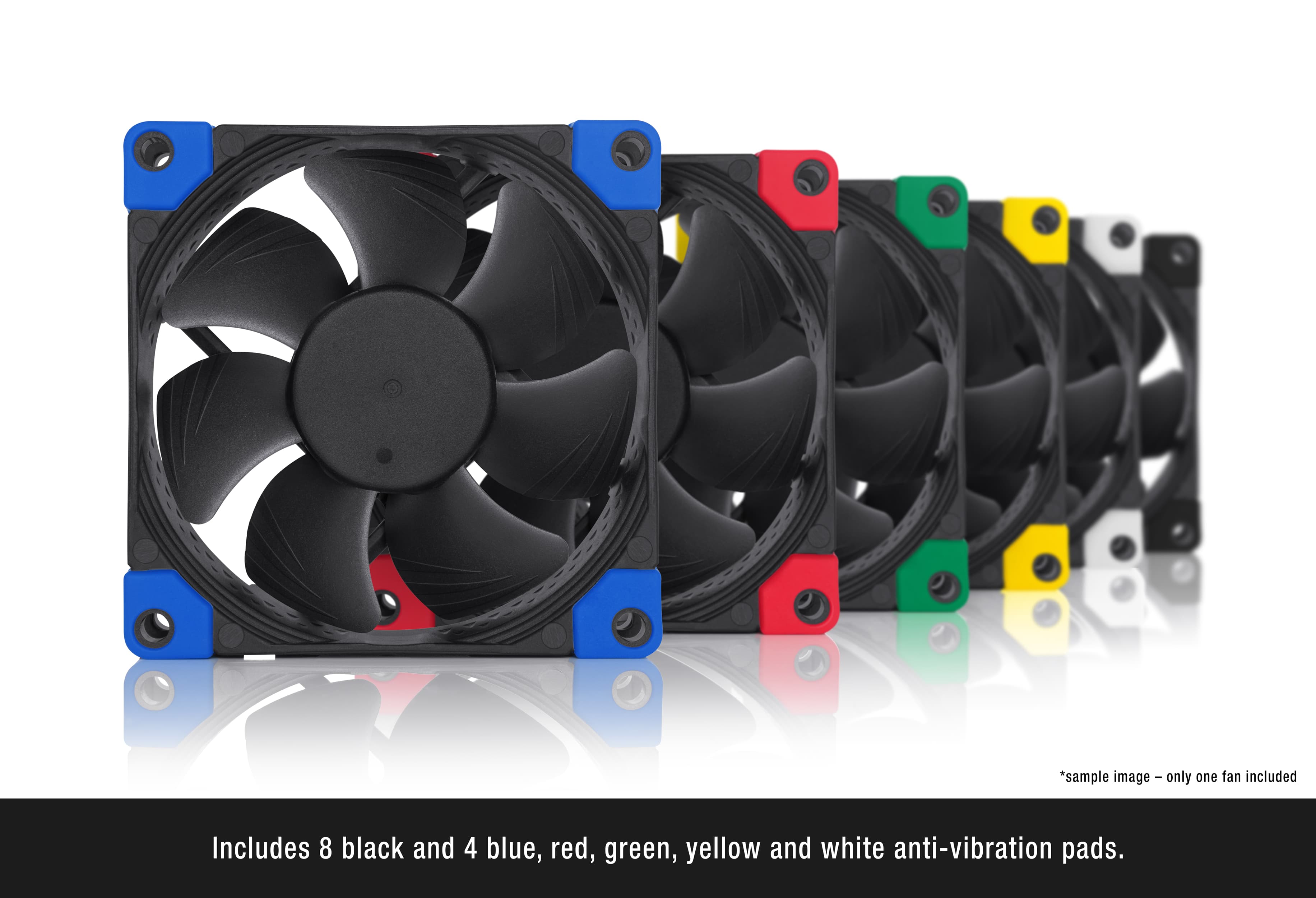 The NF-A8 PWM chromax.black.swap comes with 4 white, red, blue, green and yellow as well as 8 black NA-AVP5 anti-vibration pads. By combining the various colours with black or going all black, the fan can be coordinated with most popular build colour schemes out of the box. Additional NA-SAVP5 sets for outfitting both sides in one colour can be purchased separately.