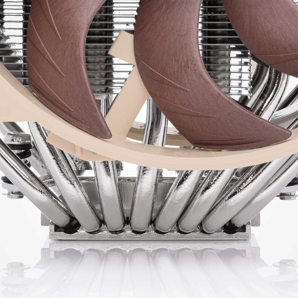 Noctua’s next-generation NF-A14x25r G2 fans set a new benchmark for performance-to-noise efficiency in round-frame 140mm fans. Their superb acoustics as well as their superior airflow and pressure characteristics are one of the cornerstones that enable the NH-D15 G2 to push beyond its legendary predecessor.