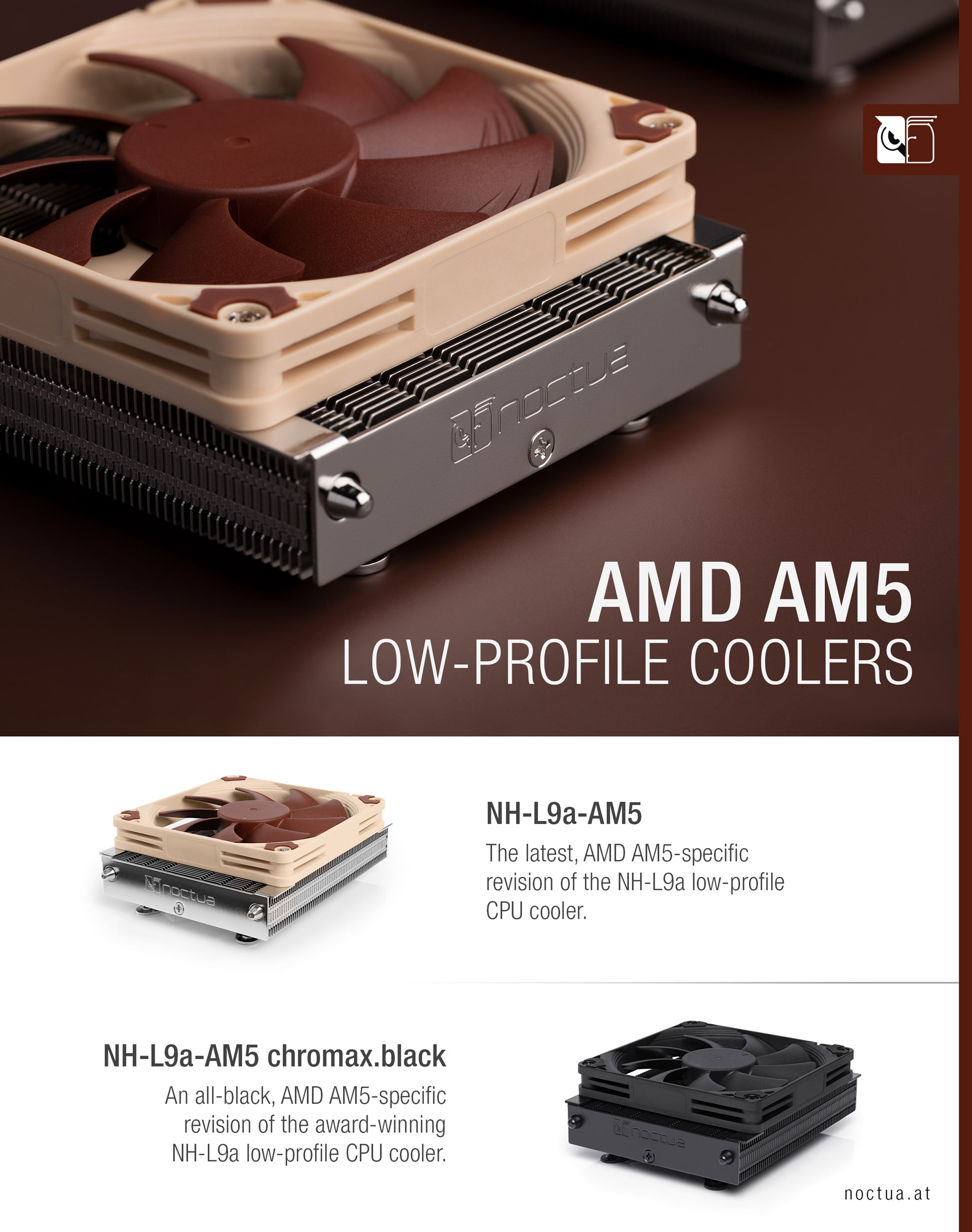 Vienna, January 24th 2023 – Noctua today presented the latest addition to its successful NH-L9 series of low-profile CPU coolers: At a height of only 37mm, the new NH-L9a-AM5 and NH-L9a-AM5 chromax.black are an excellent choice for quiet, ultra-compact HTPCs or Small Form Factor (SFF) systems using AMD’s latest, AM5-based Ryzen processors.