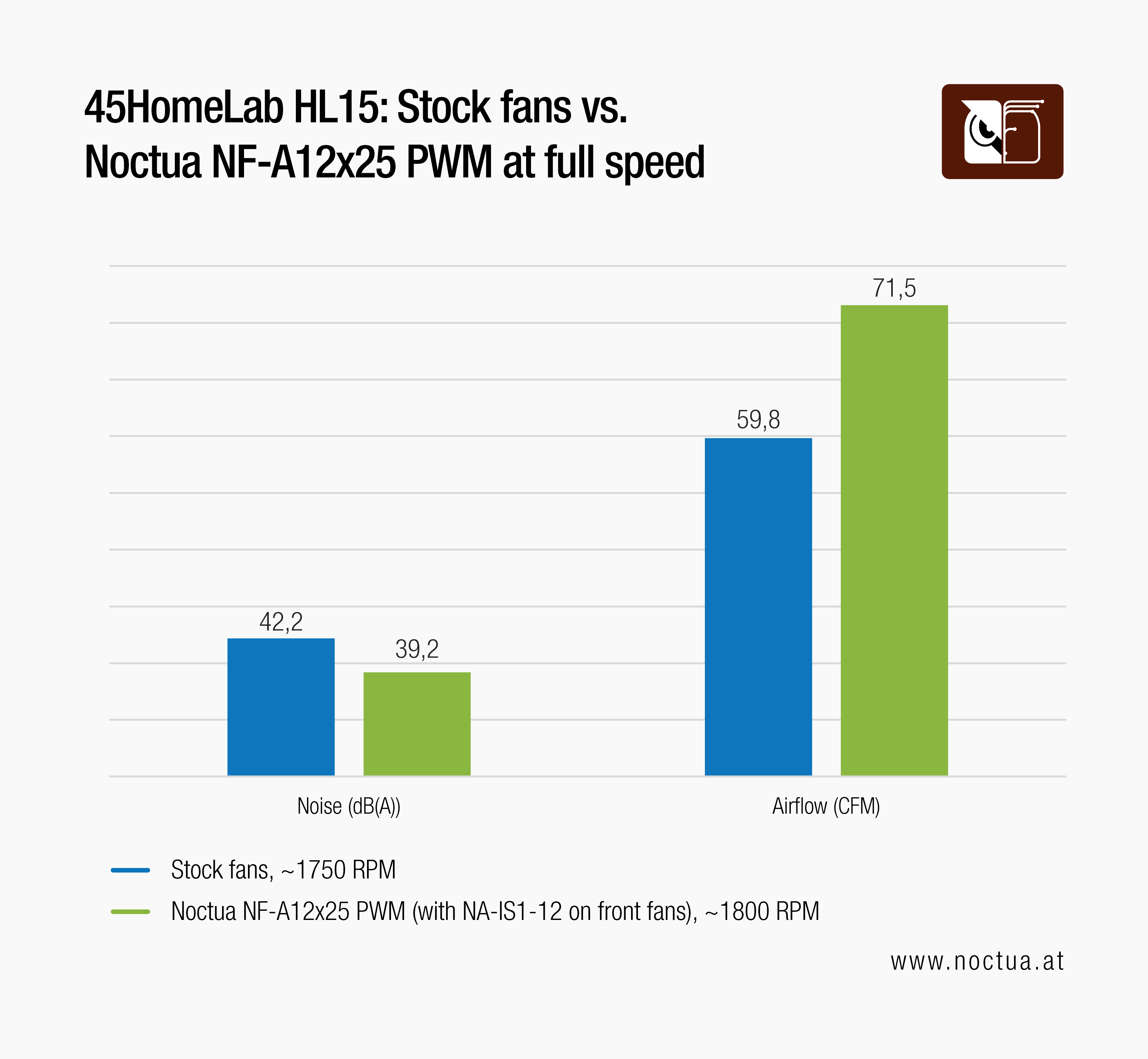 The NF-A12x25 fans not only run quieter than stock fans, however, they also produce more airflow. At full speed, with the stock fans running at ~1750rpm and the Noctua fans running at ~1800rpm, the latter are around 3dB(A) quieter while producing around 20% more airflow through the chassis:
