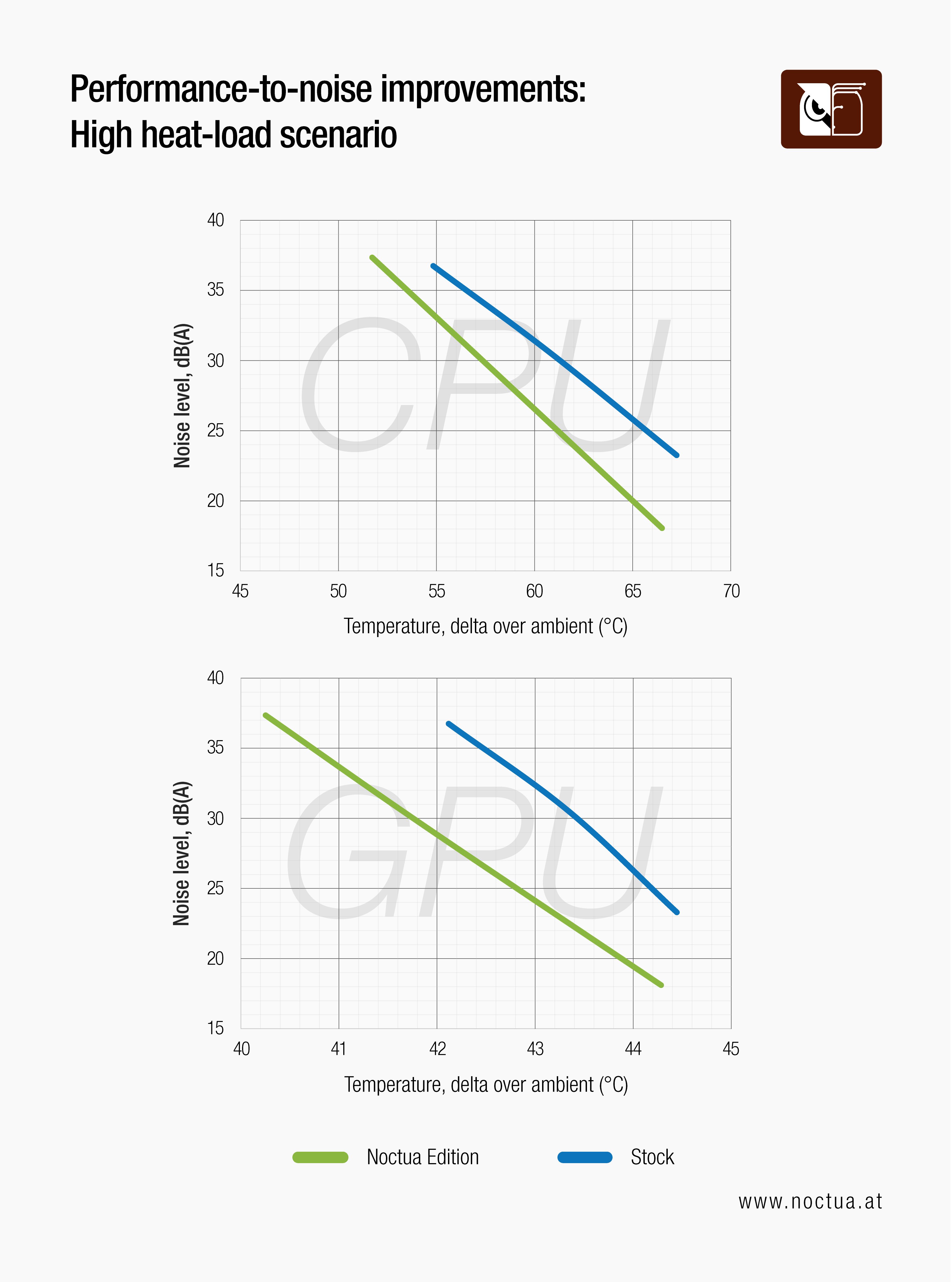 Again, this thermal advantage can be converted to around 5dB(A) lower noise levels at the same component temperatures. At maximum fan speeds, however, the stock fans already deliver more than sufficient cooling, so the benefit from the additional airflow provided by the Noctua fans is more limited with a 2°C or 3.5dB(A) improvement for the CPU and near identical results on the GPU.