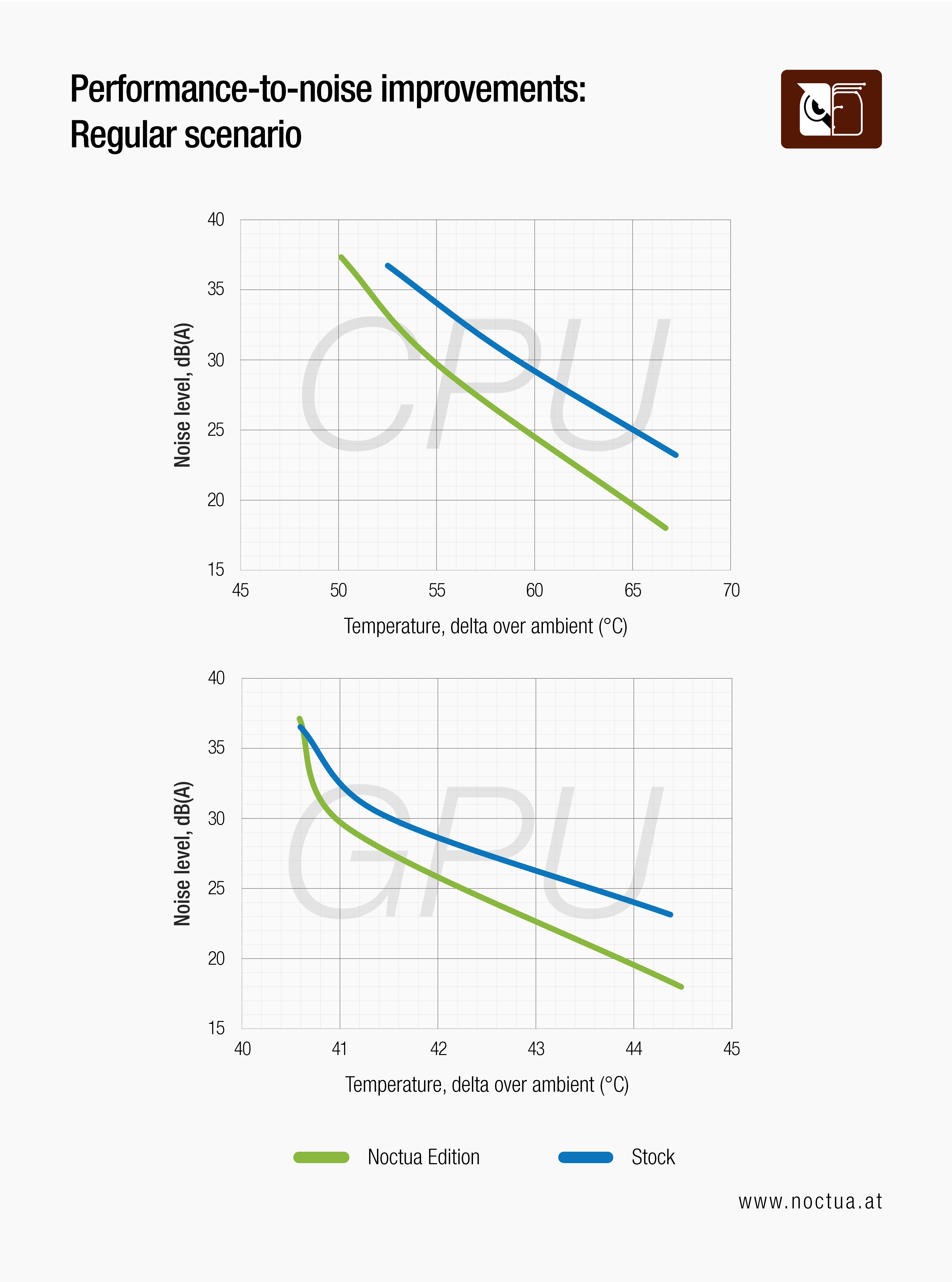 This thermal advantage can be translated into 3.5 to 6dB(A) lower noise levels at equal CPU temperatures or 6.5 to 8.5dB(A) lower noise levels at equal GPU temperatures.