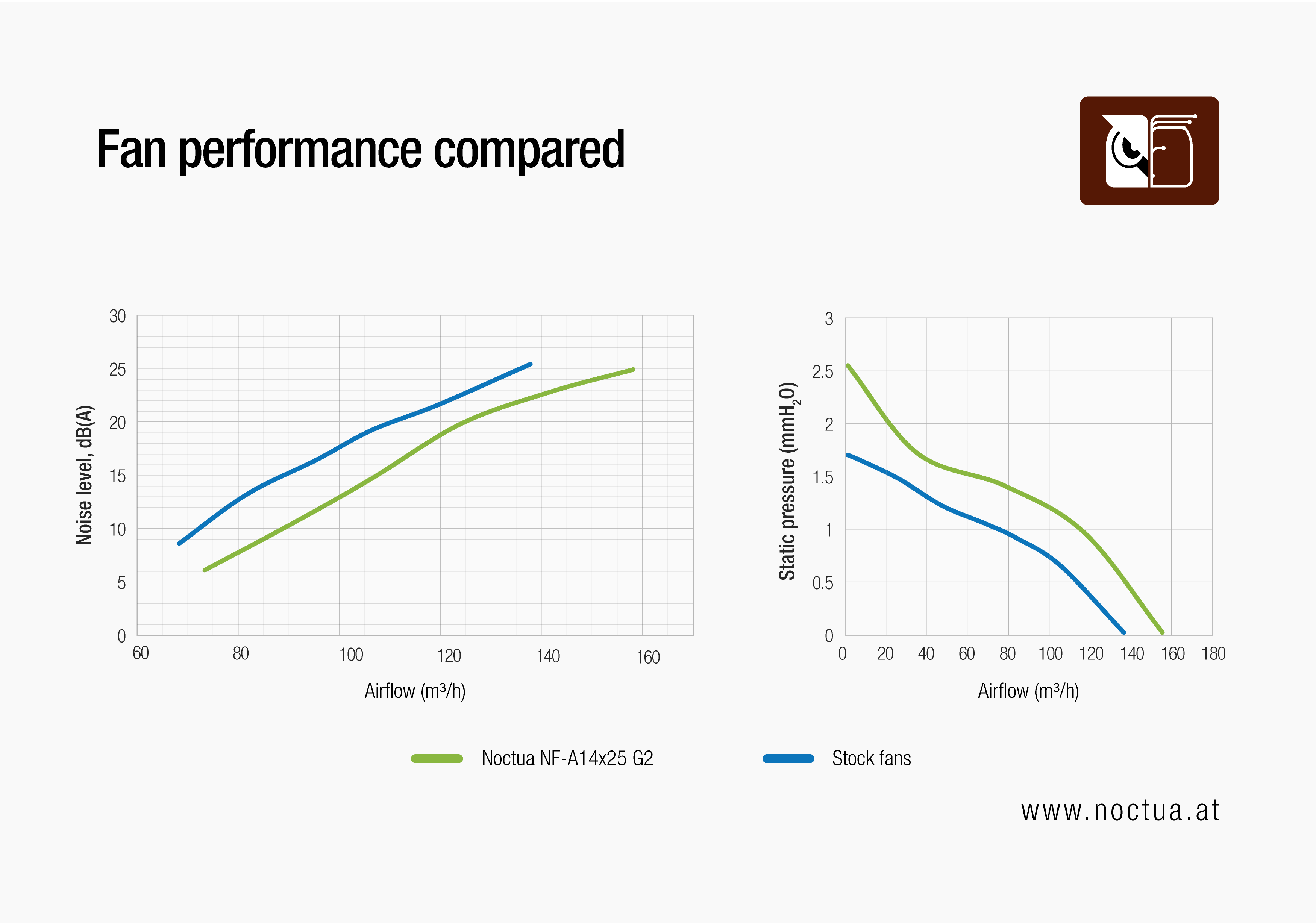 At first glance, the noise versus temperature charts with the regular heat-load setup may seem to prompt the question whether the Noctua fans actually offer any benefit over the stock Antec ones at higher RPM speeds. As outlined above, the fact that the improvements of the Noctua Edition are smaller at higher RPM speeds is due to diminishing returns from pushing extra air through the case: Once the intake air temperature of the CPU and GPU coolers is close to the ambient temperature outside the case, pushing extra air through the case can no longer yield lower component temperatures. As can be seen from the noise-to-airflow chart below, the performance-to-noise efficiency improvement provided by the NF-A14x25 G2 fans is indeed consistent across the entire RPM range: