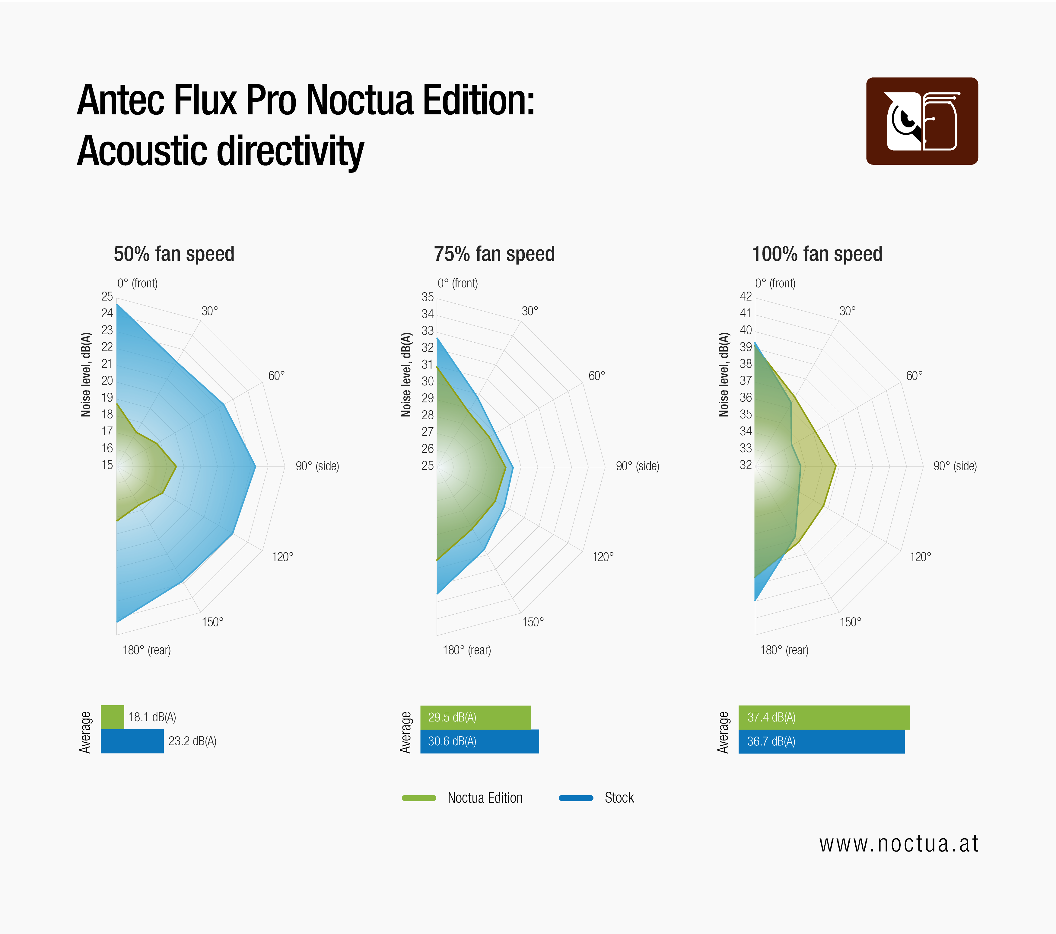 As can be seen from the resulting acoustic directivity plots, at 50% fan speed, the Noctua Edition is significantly quieter than the stock version of the Antec Flux Pro at any of the 7 angles measured with an average improvement of around 5dB(A) and peaks of up to 6dB(A). This result is particularly impressive considering that the thermal testing has shown that the Noctua Edition can provide similar thermal results at these speed settings despite the significantly quieter operation.