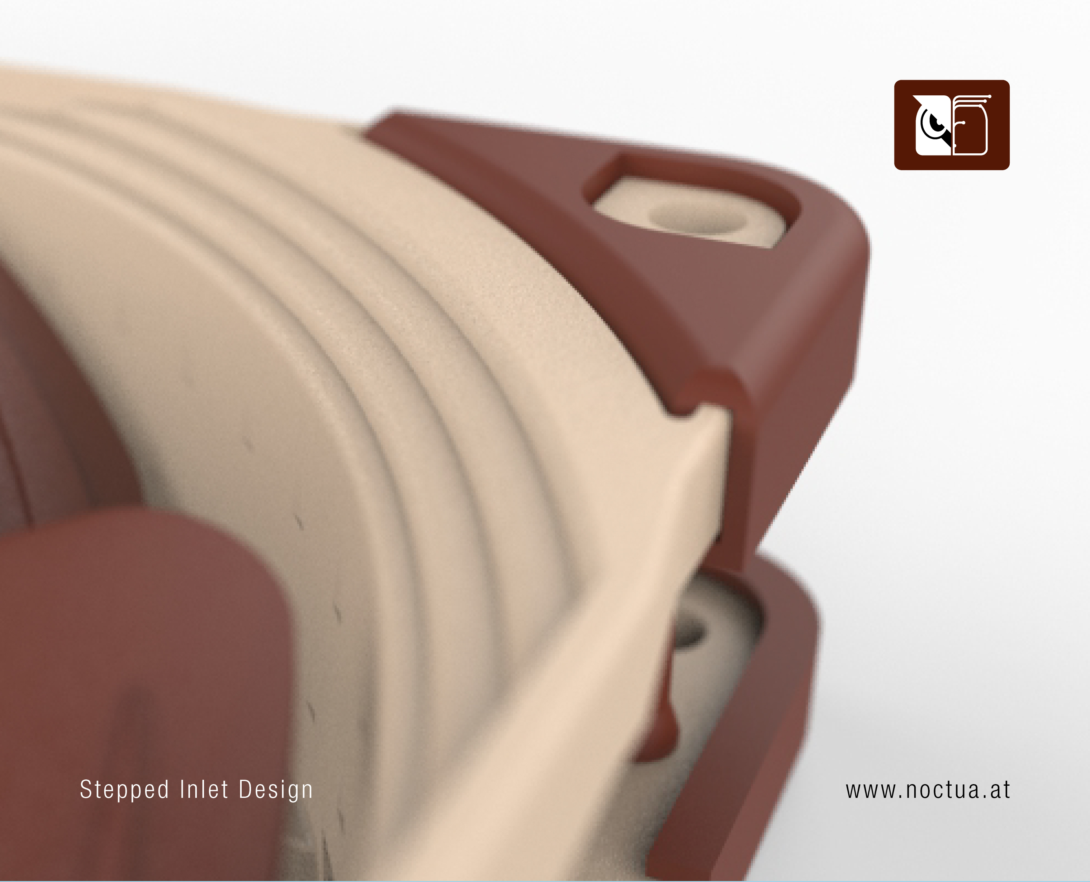 Noctua’s Stepped Inlet Design is an advanced aerodynamic design measure first introduced with the NF-F12 fan. By adding turbulence to the fan’s influx, the Stepped Inlet Design facilitates the transition from laminar to turbulent flow. This measure has an effect similar to the dimple structure of a golf ball in so far as it leads to better flow attachment to the frame, which allows the impeller to suck in more air and hence improves overall airflow efficiency.