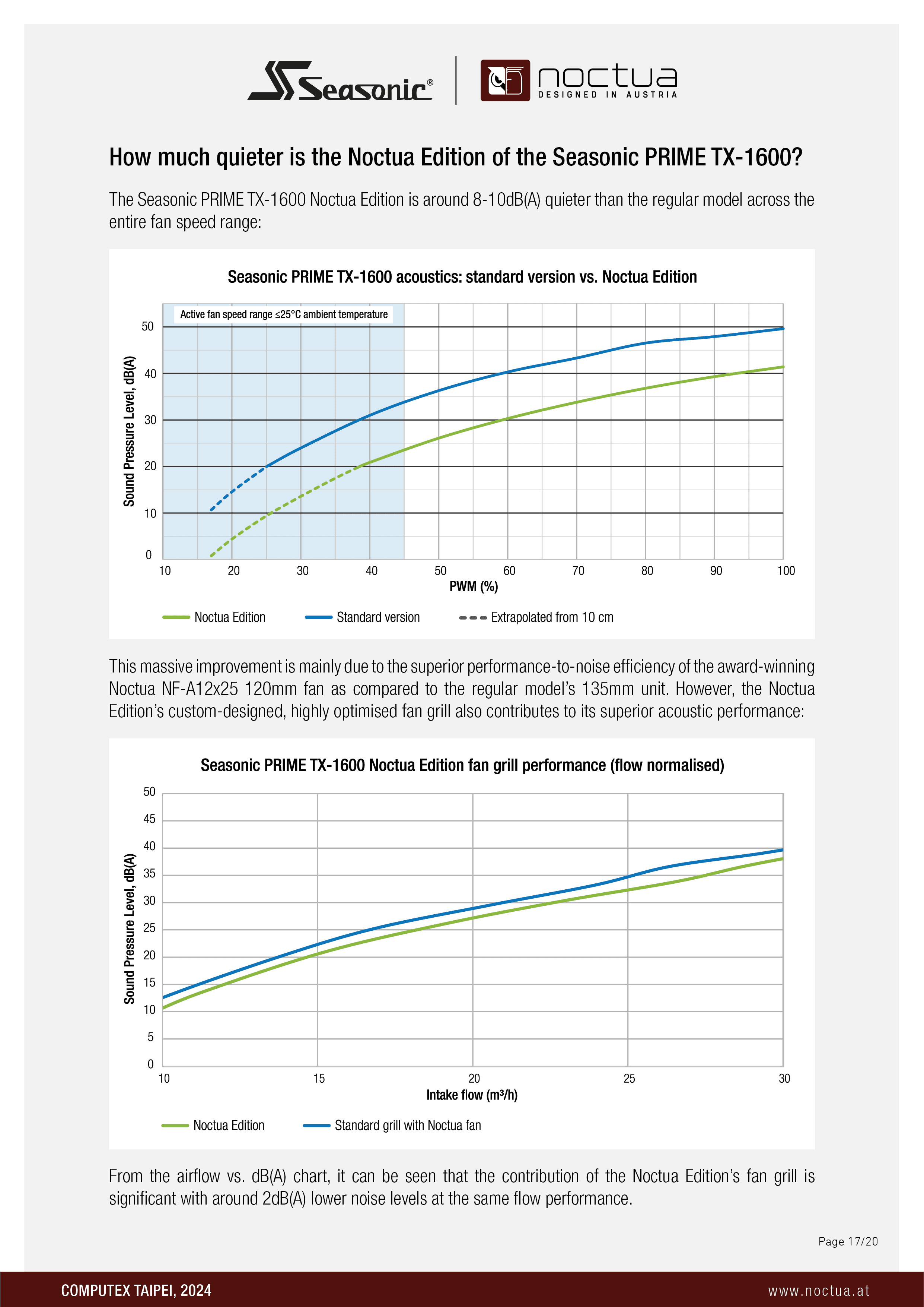 Another highlight of the show was the upcoming Noctua Edition of Seasonic’s award-winning Prime TX-1600 power supply: Using a Noctua NF-A12x25 120mm fan as well as a custom engineered fan grill that reduces turbulences in order to enhance both airflow and acoustics, the Noctua Edition can run ~8-10dB(A) quieter than the already quiet standard version. The Seasonic Prime TX-1600 Noctua Edition is currently scheduled for a Q4 2024 release.