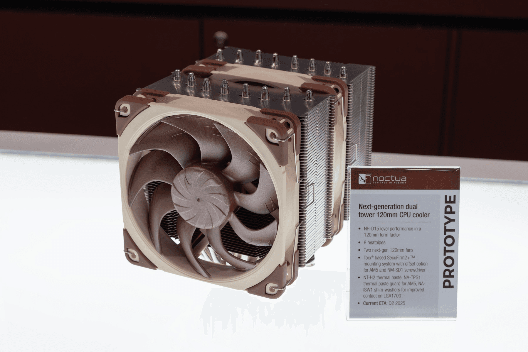 The next-gen 120mm fan will also be employed in a novel dual tower 120mm flagship model CPU cooler that’s currently on the roadmap for Q2 2025. With two of the new 12cm fans, 8 heatpipes and a dual fin stack that’s tailored to make best use of the new fan’s higher pressure characteristics, this cooler will offer a similar level of performance as the current NH-D15 in a 120mm form factor.