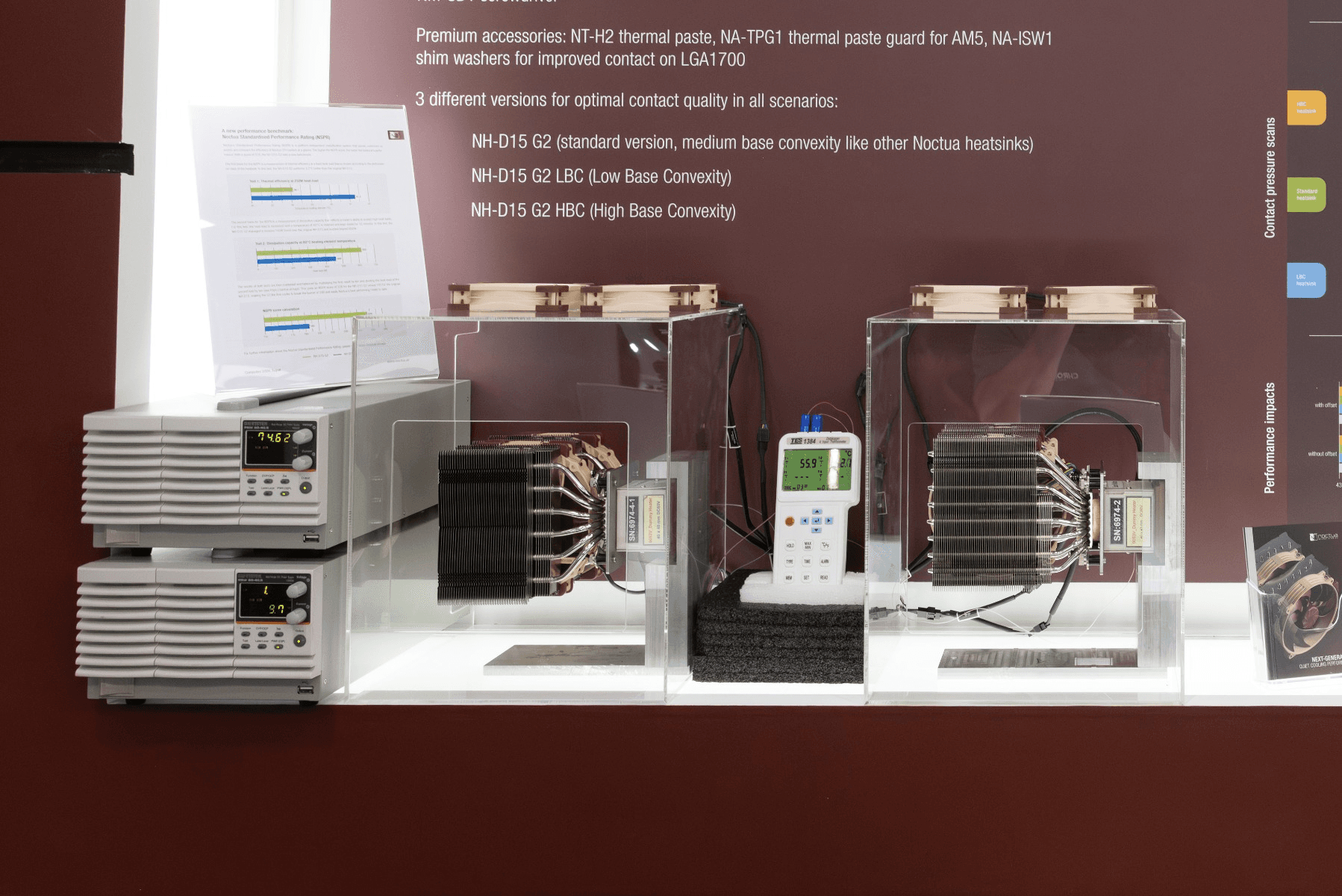 In a live on-site demonstration, the NH-D15 G2 was capable of dissipating more than 600W on a standardised synthetic heating element with a maximum temperature of ~60°C whereas the first-generation NH-D15 could only support around 430W in the same setting. On modern AMD and Intel CPUs with 180-250W heat-loads, this performance advantage will typically translate into a 2-3°C temperature reduction.