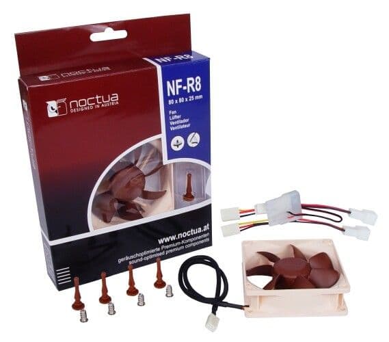 The NF-R8 is the first fan employing a novel 80mm rotor which was developed by the Austrian Institute for Heat-Transmission and Fan Technology (Österreichisches Institut für Wärmeübertragung und Ventilatorentechnik, ÖIWV). Thanks to the special optimisation of the blade geometry towards ultra low noise application, the NF-R8 is up to 10% more quiet than current high-end fans at the same flow rate. The NF-R8 series is also equipped with a magnetically centred, self lubricating oil-pressure bearing (SSO) that provides a new level of quietness and long-term stability.