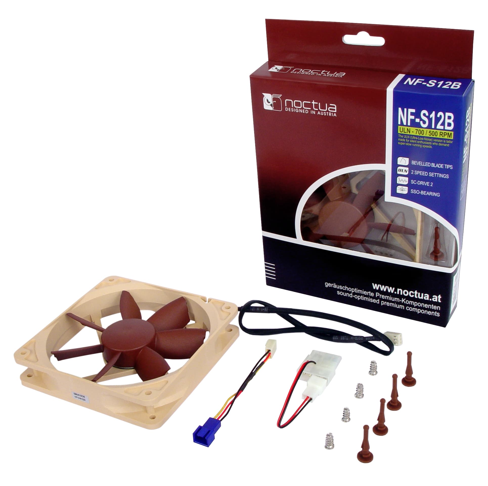 Succeeding the vastly successful NF-S12, the NF-S12B is a next generation quiet fan featuring Noctua's advanced SCD2 technology as well as a highly optimised blade geometry with Bevelled Blade Tips that improves its award-winning predecessor's airflow efficiency by up to 10%. Topped off with Noctua's time-tested SSO-Bearing, 6 years warranty and super-slow 700/500 rpm speed settings, the NF-S12B ULN is a premium quality fan for ultra-low-noise applications where maximum quietness has top priority.