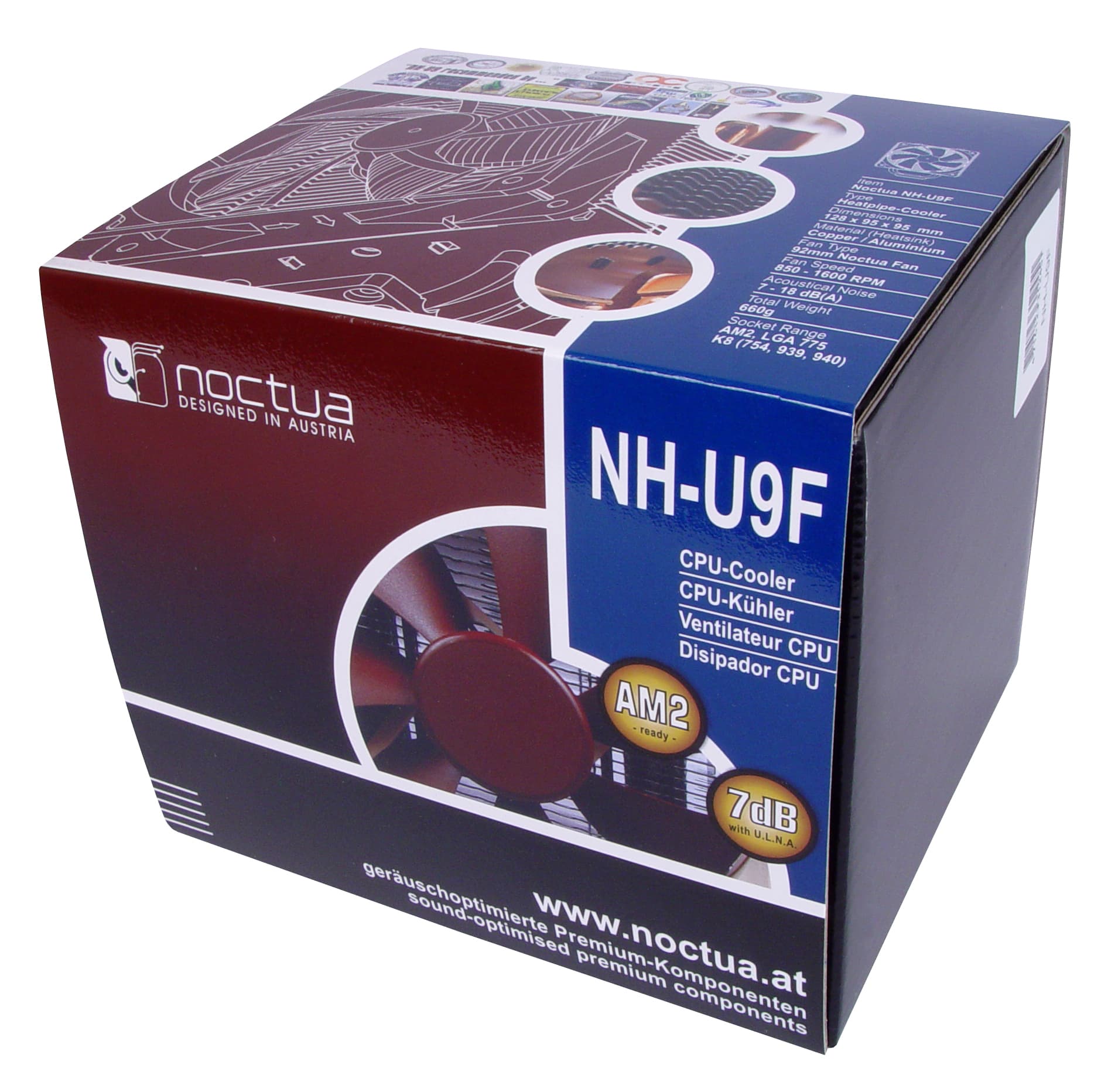 The NH-U9F is the newest version of the NH-U9, which won over 50 awards and recommendations from leading international web sites and magazines. The NH-U9F can be rotated by 90° on all sockets, boasts full compatibility with AMD's new AM2 socket and comes equipped with a Noctua 92mm fan, which has a minimum noise rating of only 7dB(A)*. Thanks to the 4 Dual-Heat-Pipes, 37 aluminium cooling fins with a total surface area of more than 3800cm² and soldered joints for optimal heat-transfer, the Noctua NH-U9F achieves superior cooling performance at minimum noise levels.