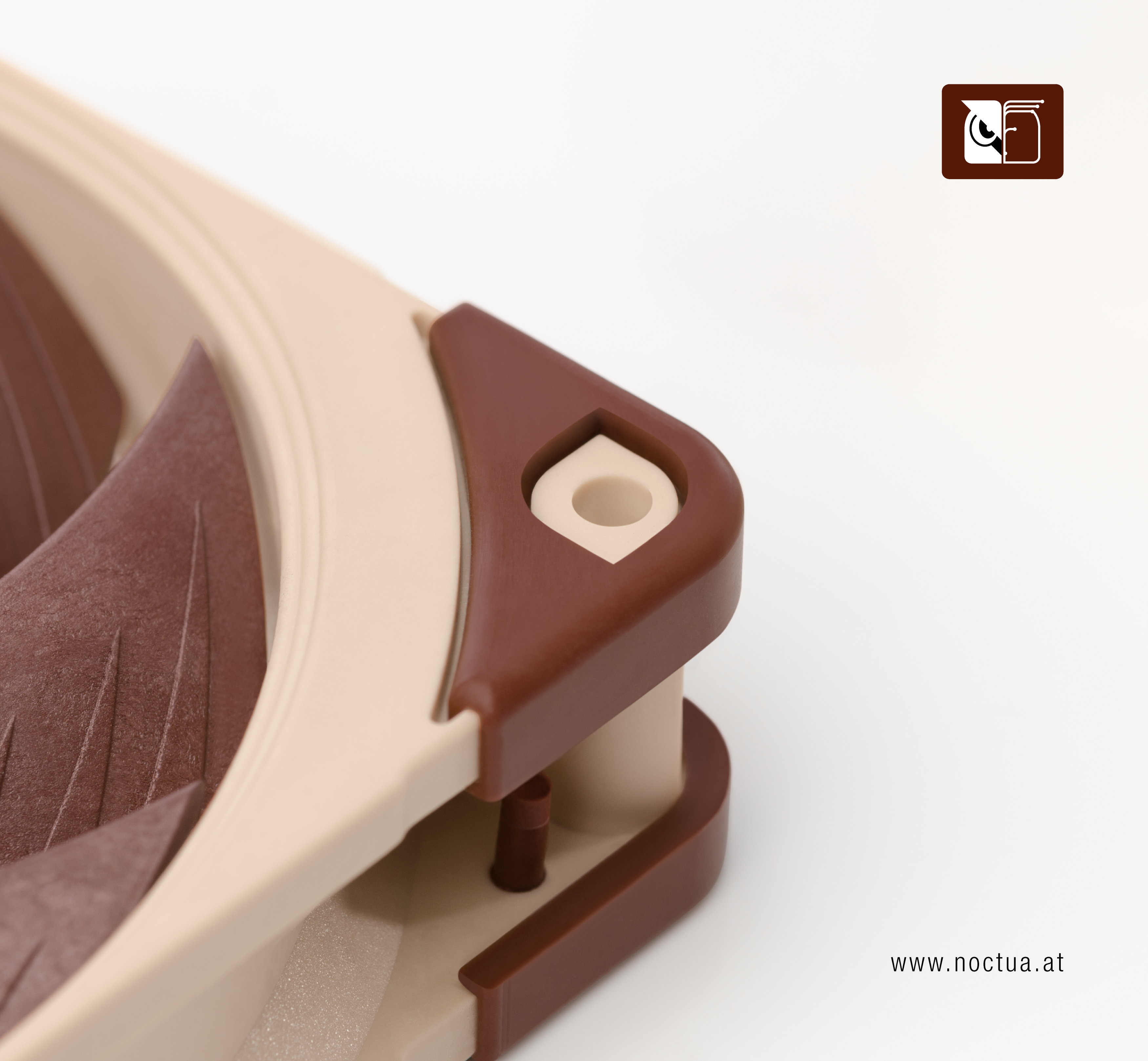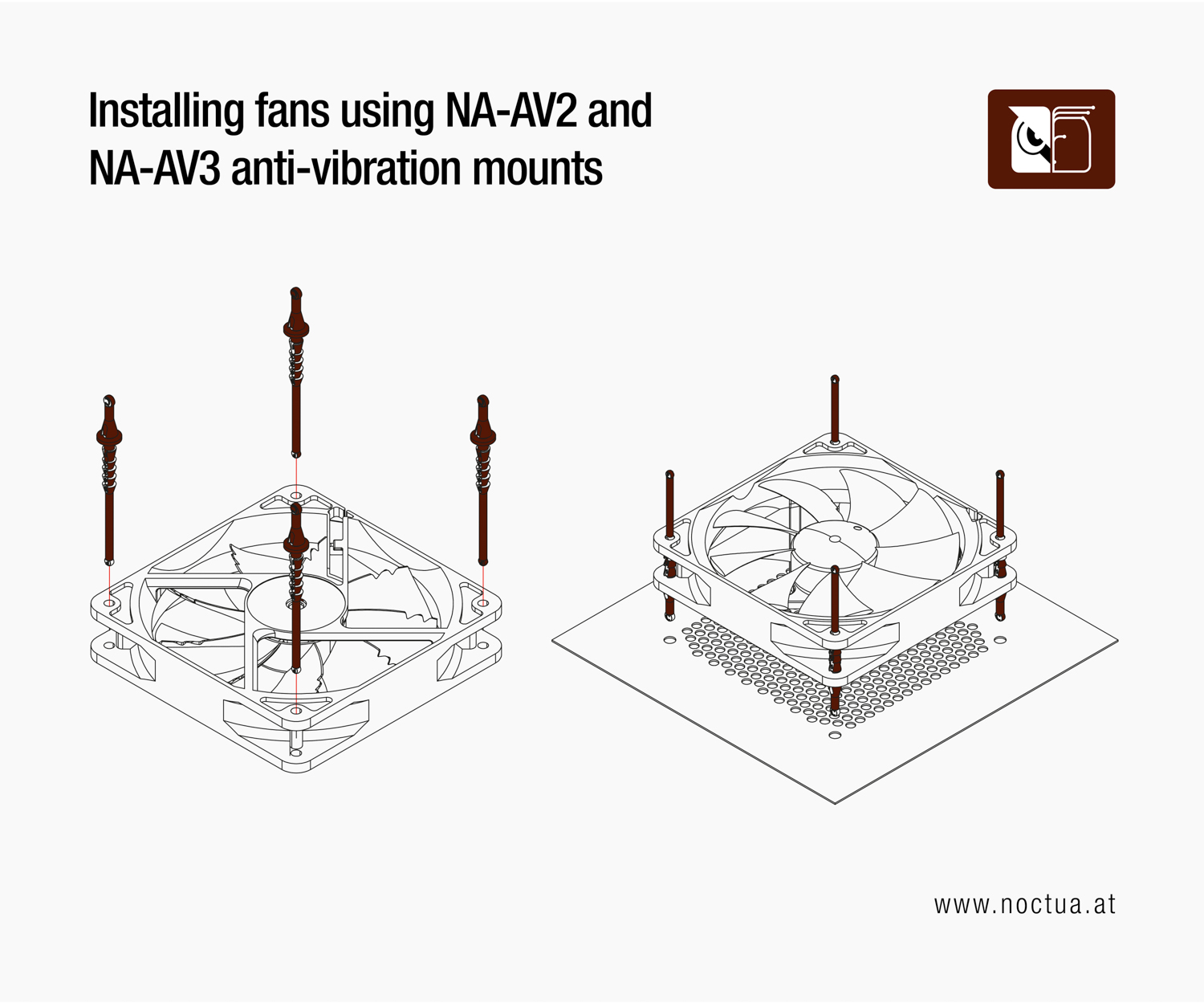 Single sided anti-vibration mounts, such as the NA-AV1 and NA-AV4 mounts, are first pushed through the mounting holes of the case and then pulled through the mounting holes of the fan.