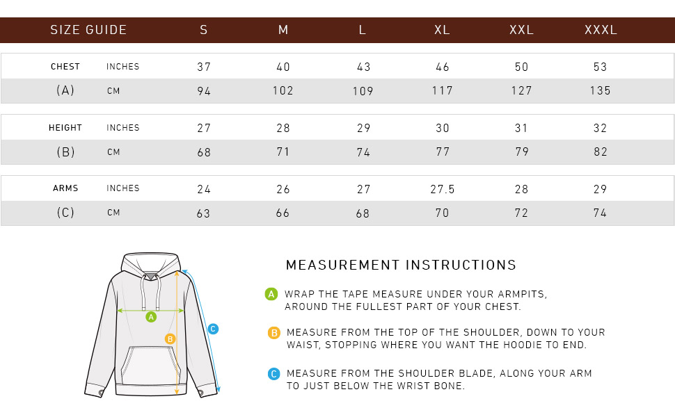 Please consult our size chart to ensure that your hoodie is best matched to your height and build.