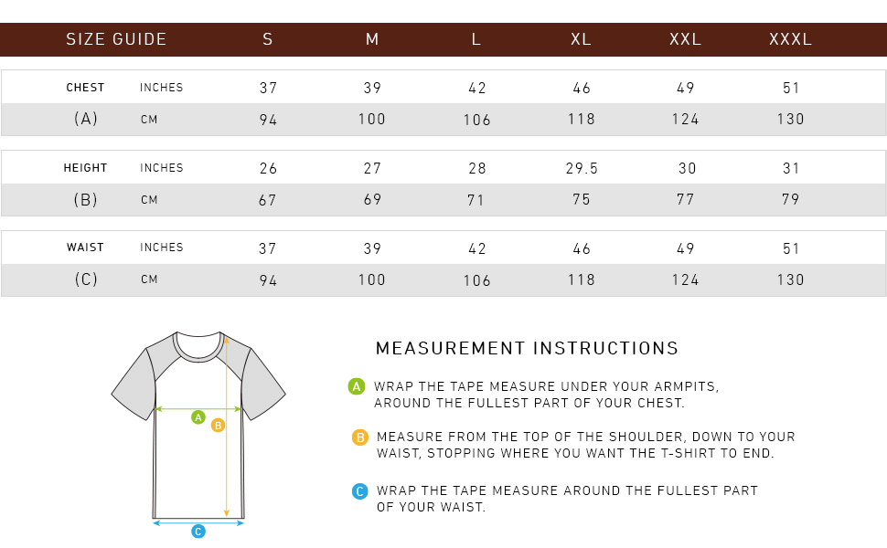 Please consult our size chart to ensure that your T-shirt is best matched to your height and build.